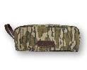 Heavy duty cotton canvas exterior with internal lining for protection. Interior includes a side pocket and secure zip pocket. Mossy Oak Bottomlands camo. Leather accents, including handle, zipper pull and Ducks Unlimited logo patch.
