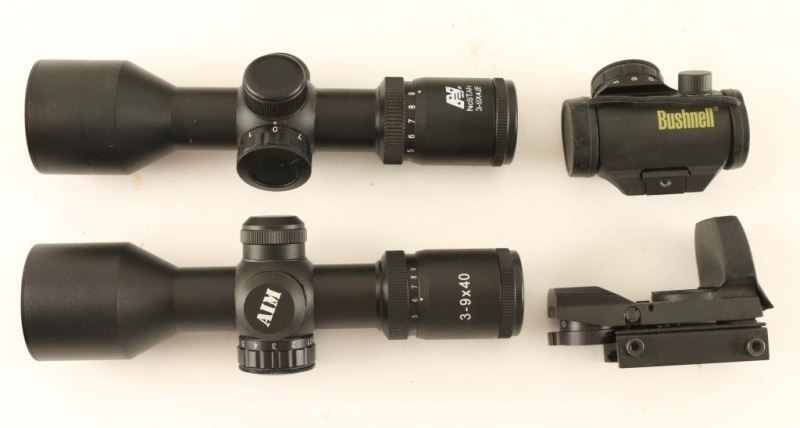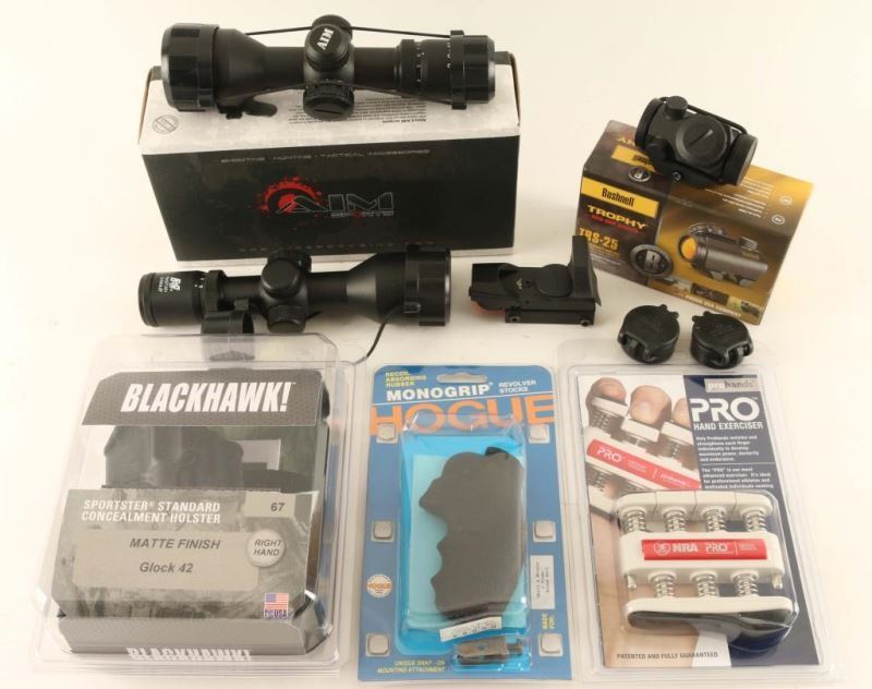 Including; Blackhawk Sportster Standard Concealment Holster for Glock 42, Pro Hands Hand Exerciser, Hogue Monogrip for S&W J Frame round butt, Bushnell Trophy Red Dot Sight-TRS-25, Aim Sports 3-9x40 Dual-illuminated Compact Scope, NC Star 3-9x42F scope, and a scope mount.