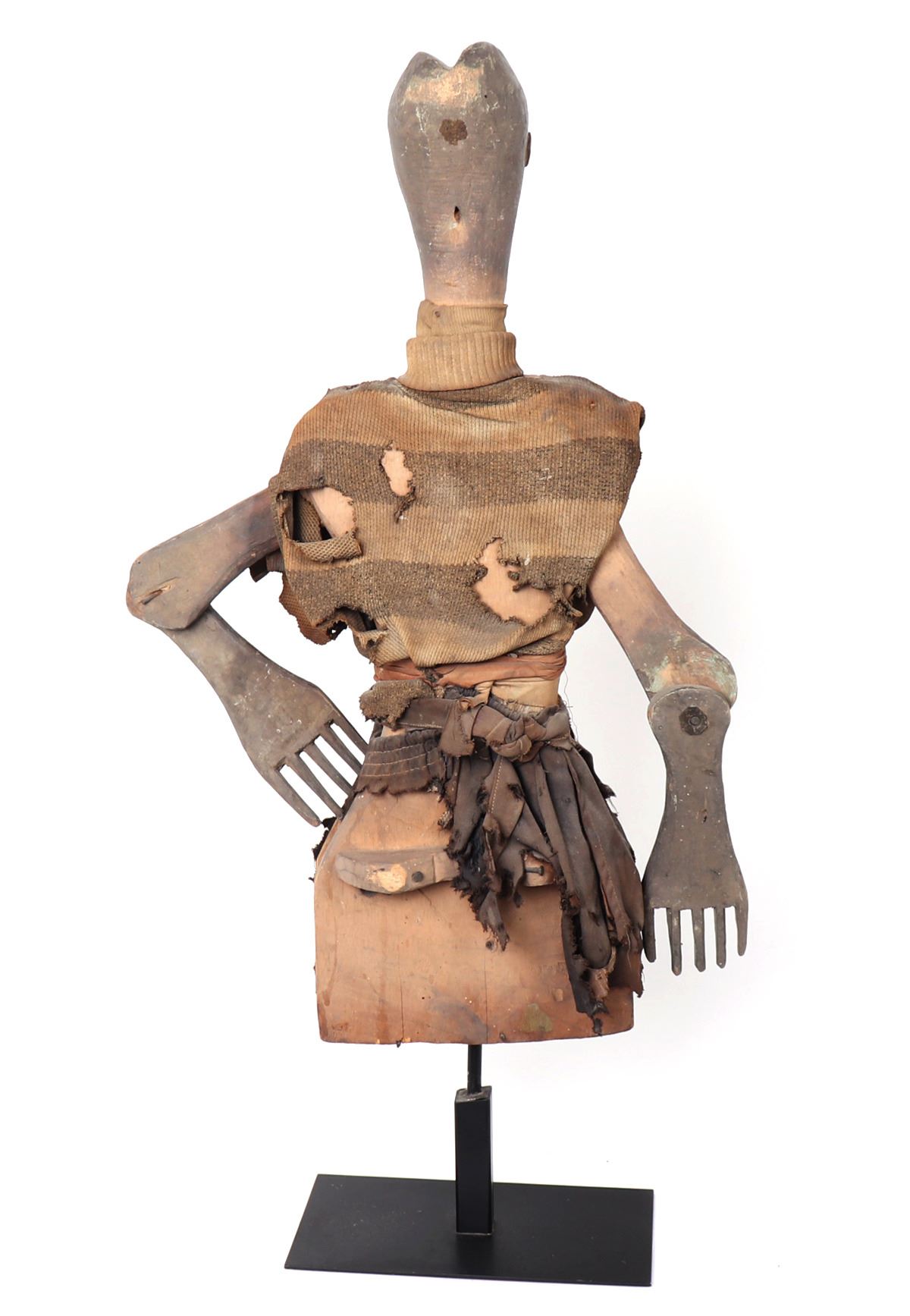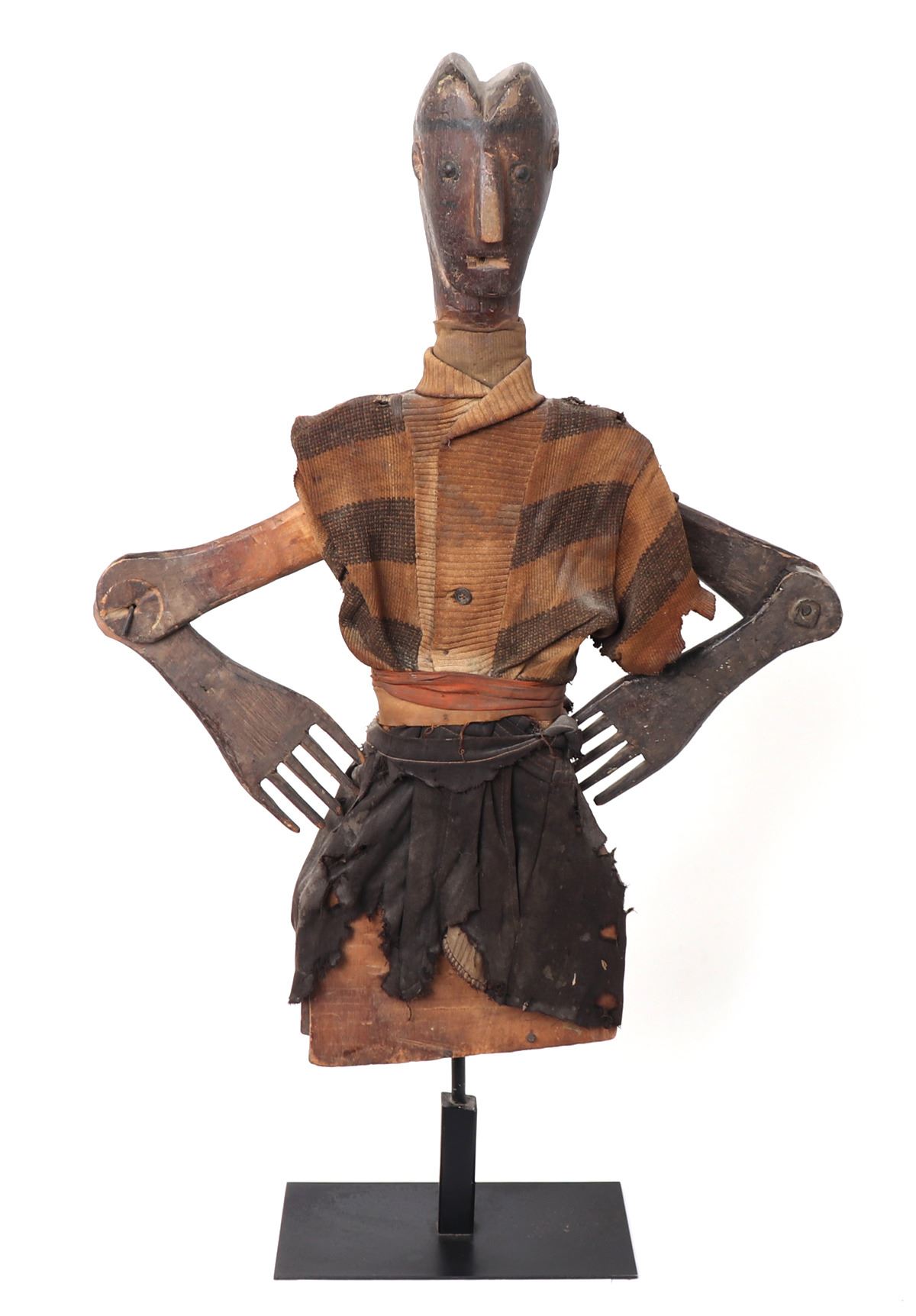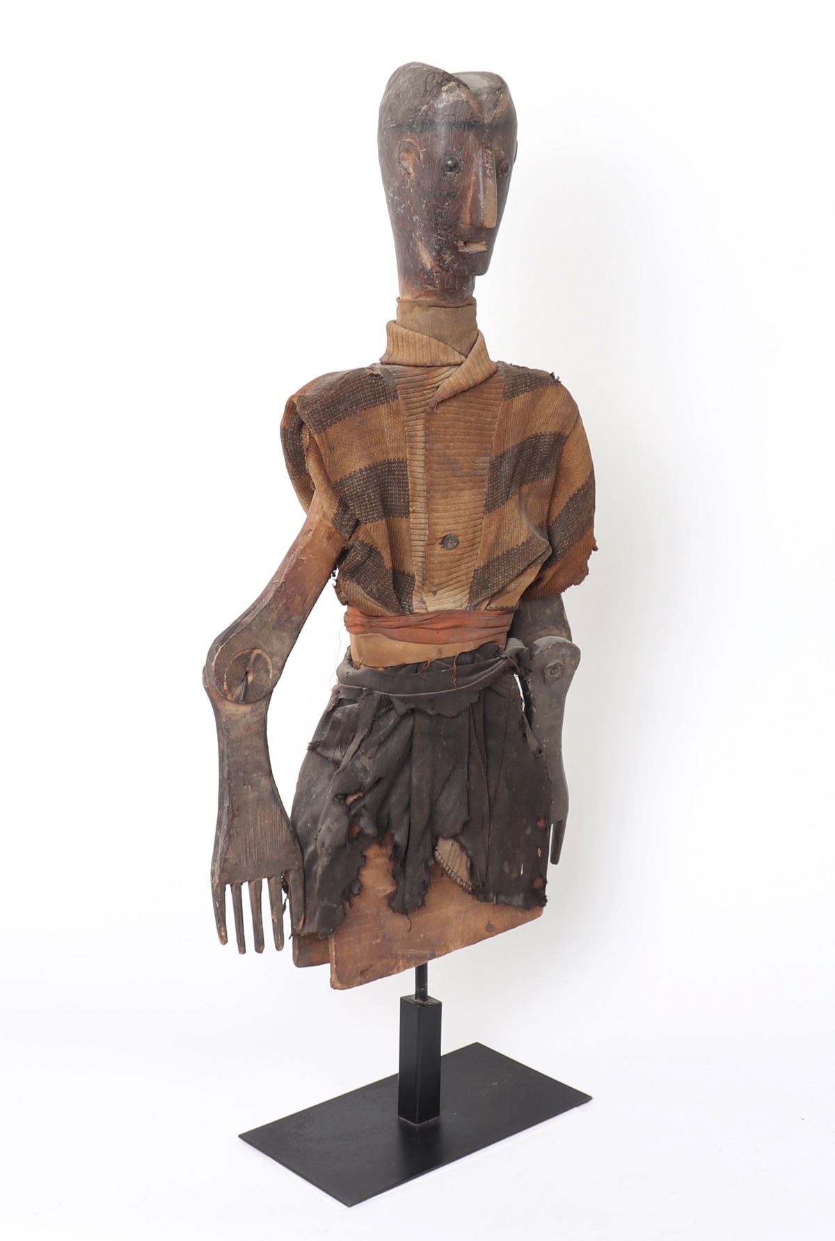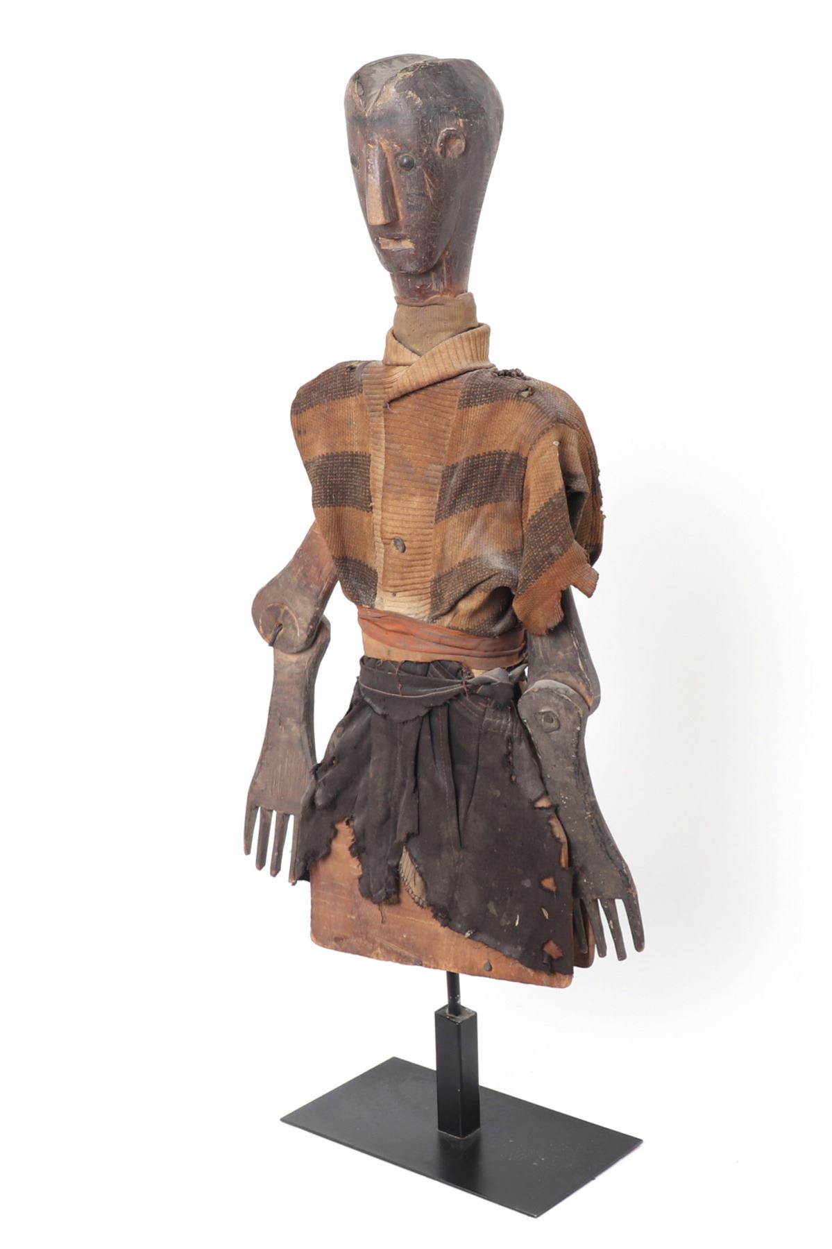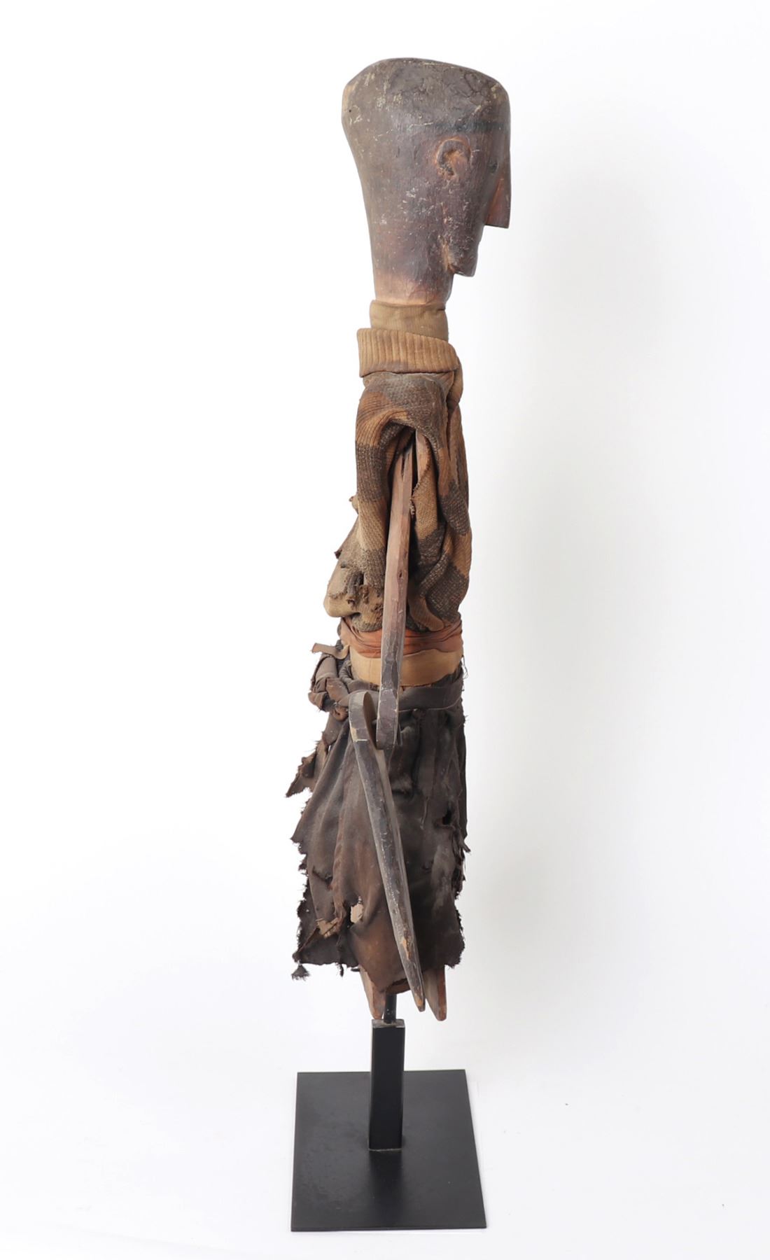 West Africa, Mali, Bozo or Bamana peoples. Marionette Merekun wood statue on custom stand. Heart shaped head with an indent stylisticly carved into the figures head. Remnants of dark red pigment and black highlights. Heavy white cotton sweater with black horizontal stripes and buttons. Each arm carved in two flat sections with hinge to the elbow. Wood carved lower body in two flat panels covered in light orange and yellow textiles with a black skirt. Size 32" H x 11" W x 2" L. For a similar example see the Metropolitan Museum of Art (Accession Number 1979.206.52). Condition: Loss and wear overall commensurate with age and use. Provenance: Ex-Southern Califonia collection, purchased March 24th 1986