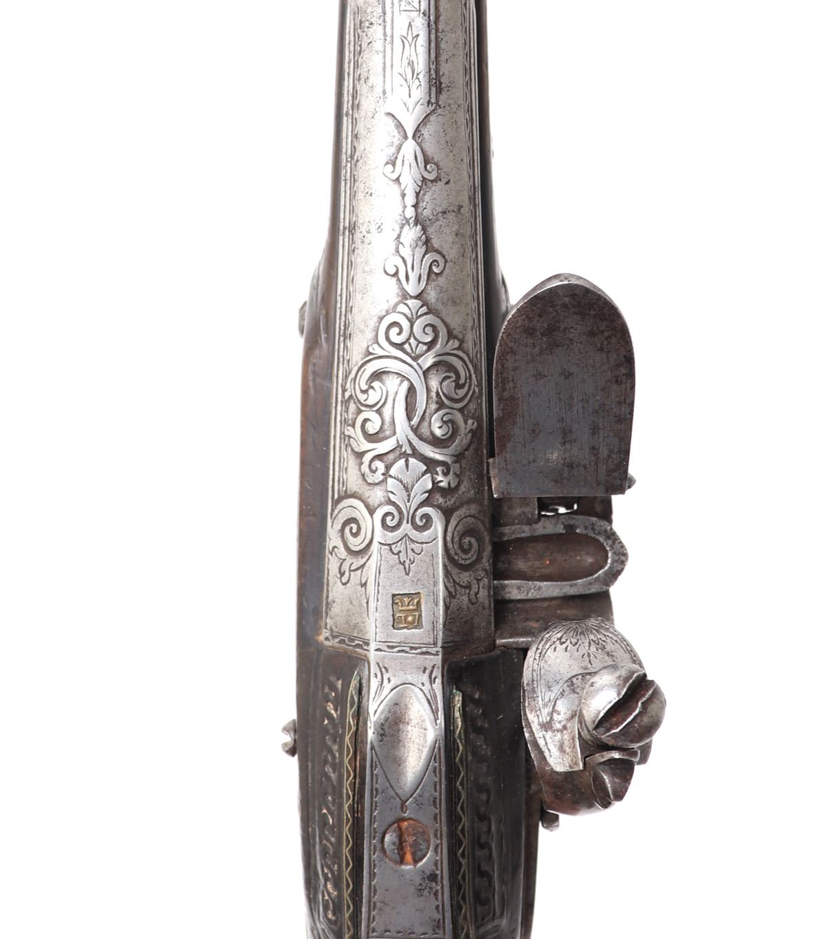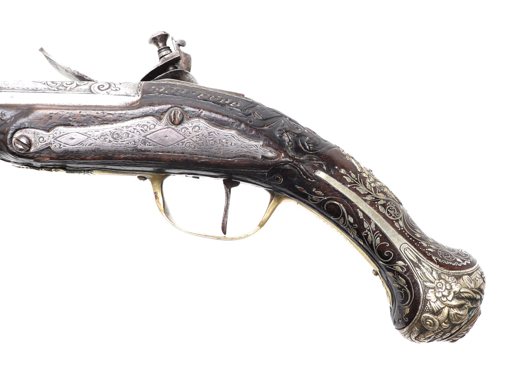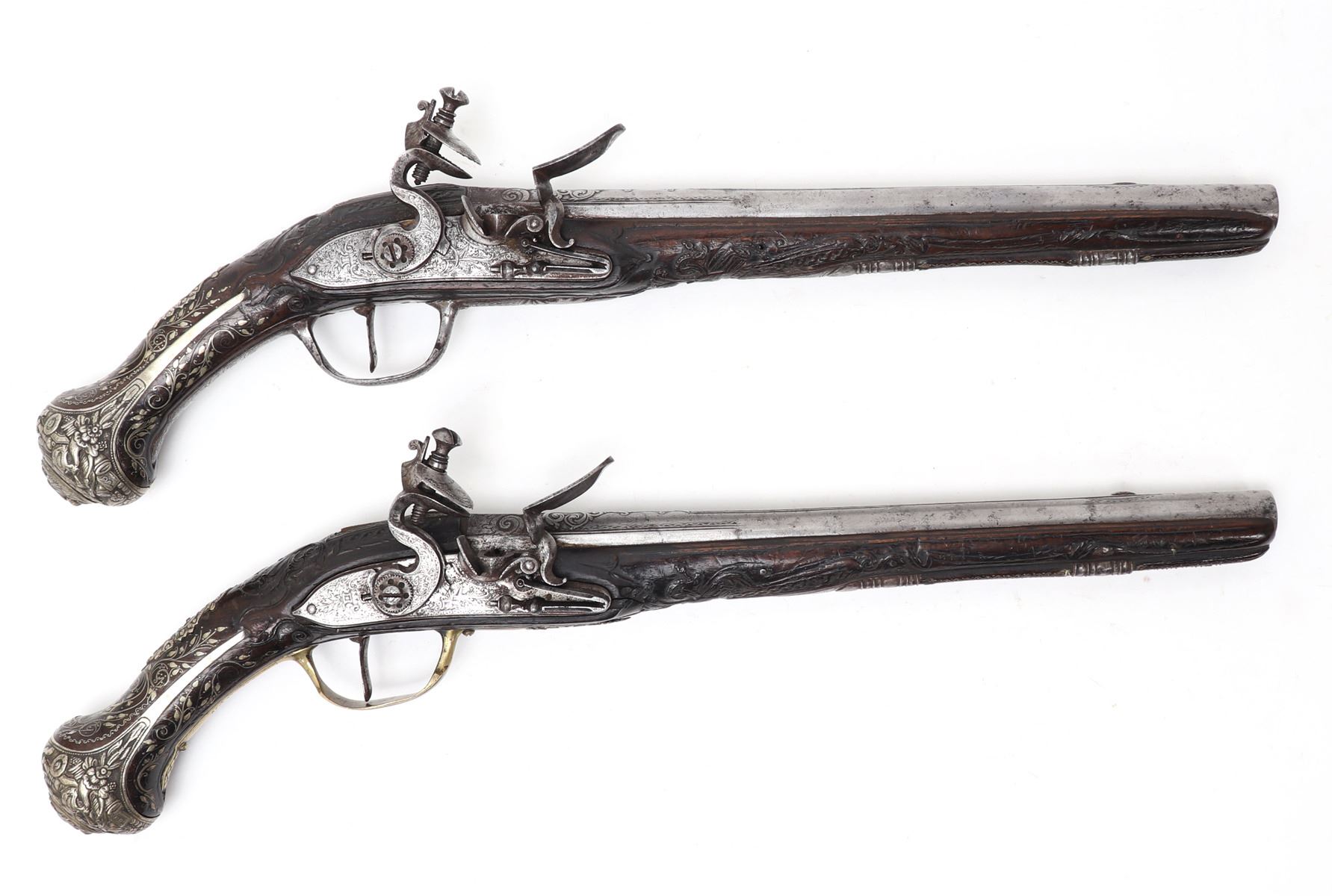 Brace of Silver Inlaid & Engraved Flintlock Cavalry Pistols, Late 18th c.