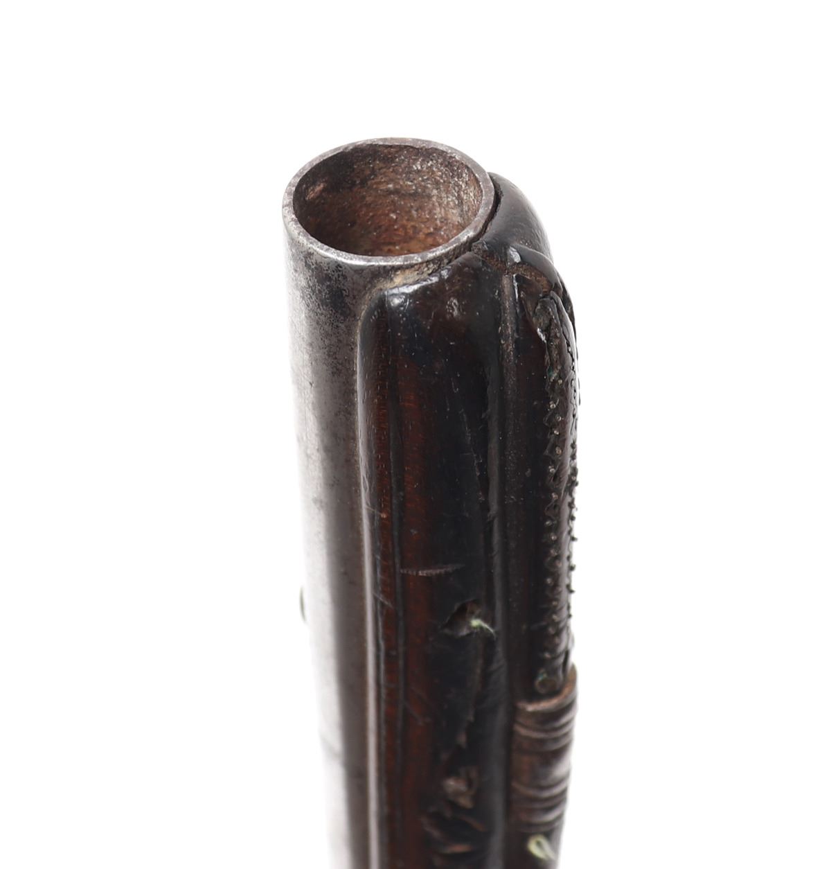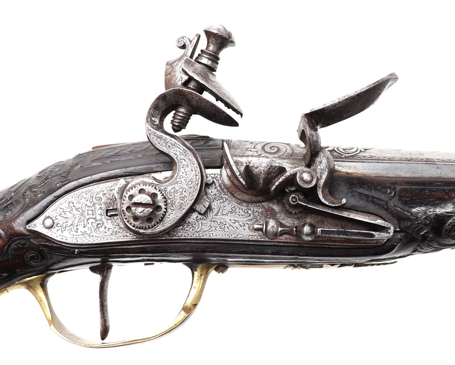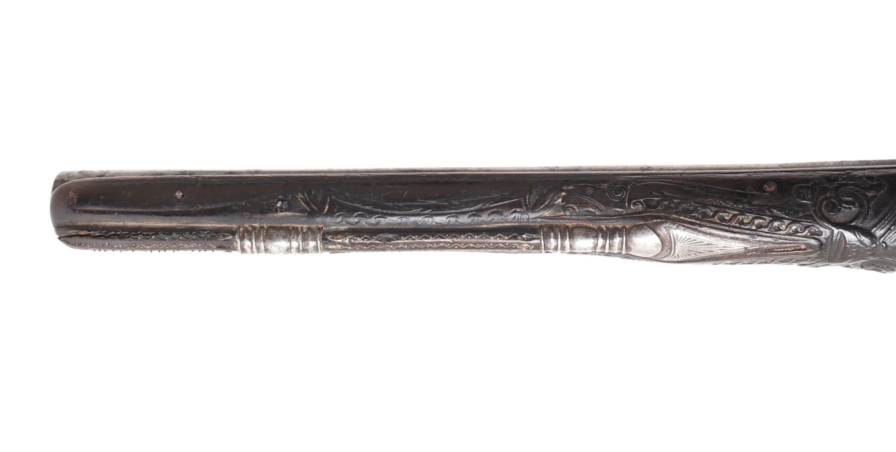 Brace of large European cavalry pistols for the Ottoman market, circa 1780-1825. Walnut stocked profusely inlaid in silver decoration with floral motifs and wood carved panoply of arms. Trigger guard in brass to one and steel the other, each engraved (NONONO). Round barrels with relief decoration in steel and inscribed with additional writing. Barrel stuck with hammer mark of a crown over inverted (P) and (I). Especially finely made flintlock mechanism with fine European quality engraving matching remainder. Size 19" L, barrel 12 1/4" L, barrel width .65". Condition: wear commensurate with age an use. Minor looseness or absent inlay.. Provenance: Ex-Private USA Collection