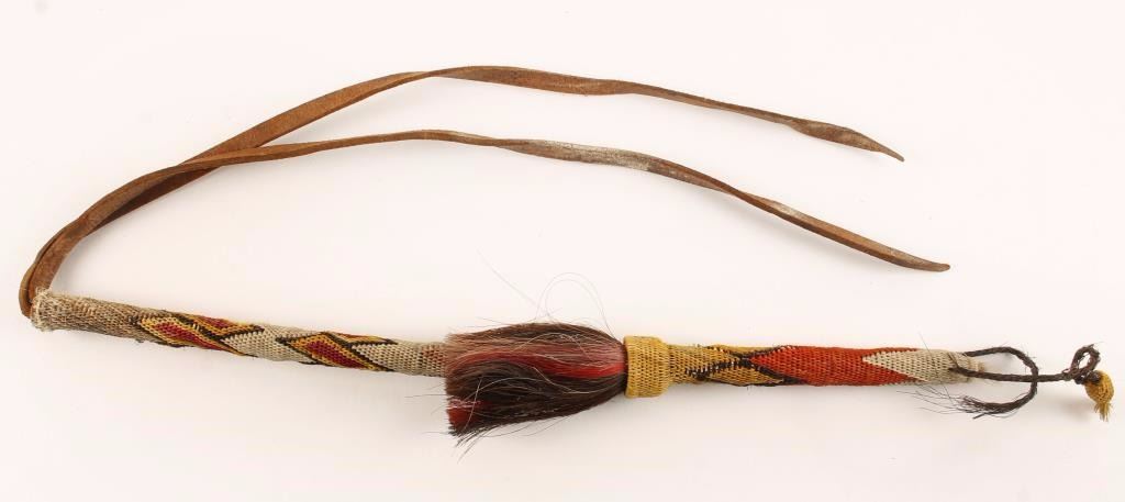 With geometric pattern in black, tan, yellow and red colors. Features leather straps, braided lanyard and one mane hair tassel. Measures 33" overall. In overall fair to good condition showing age and some losses.