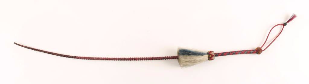 With semi-stiff limb spiral wrapped in red and blue horse hair. Features a white and blue mane hair tassel, white blue, yellow and red geometric hilt & pommel and red wrist strap. Measures 29" overall. Condition is good to very good with minor losses and color fade.