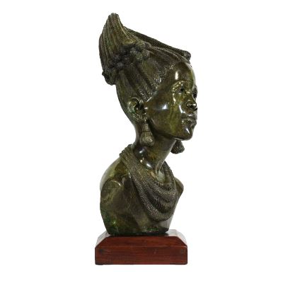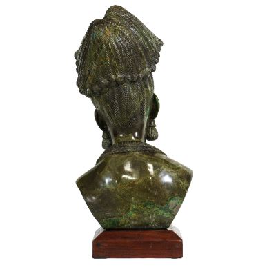 Expertly carved from authentic green verdite stone, the piece showcases intricate braiding and layered necklaces, reflecting Tandi’s mastery in capturing cultural elegance and lifelike detail.