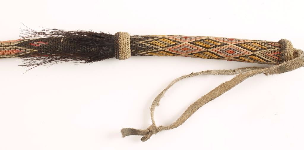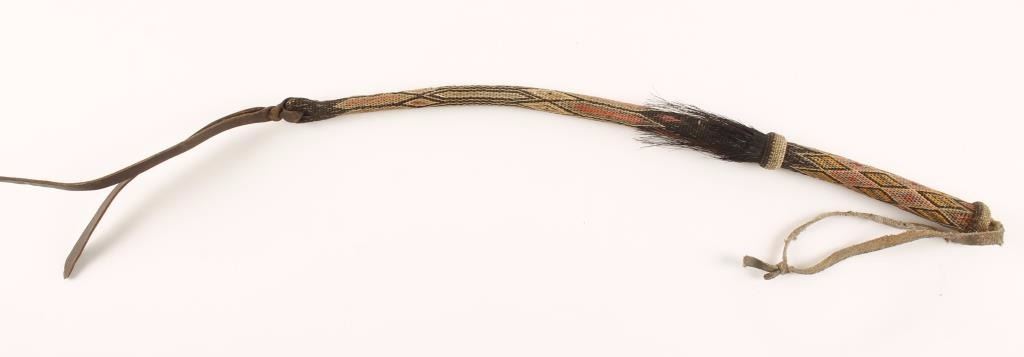 Made in Montana State Prison circa 1910 - 1920. Multi color horse hair geometric design. Braided handle and hitch with leather straps and a black mane hair tassel. Measures 25" overall. In good to very good condition showing minor losses and faded colors.