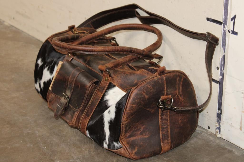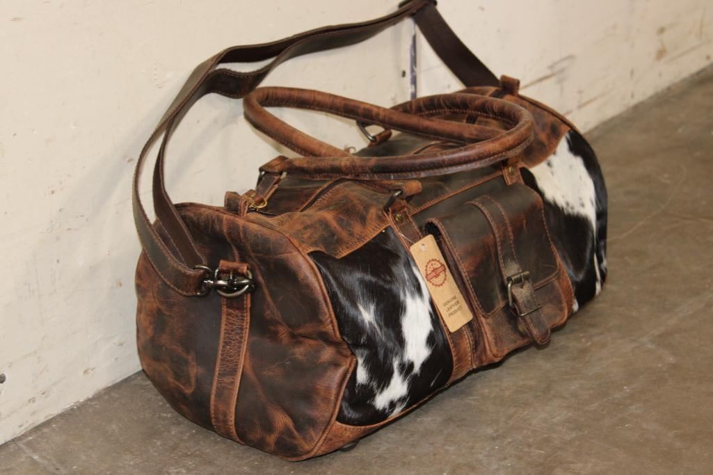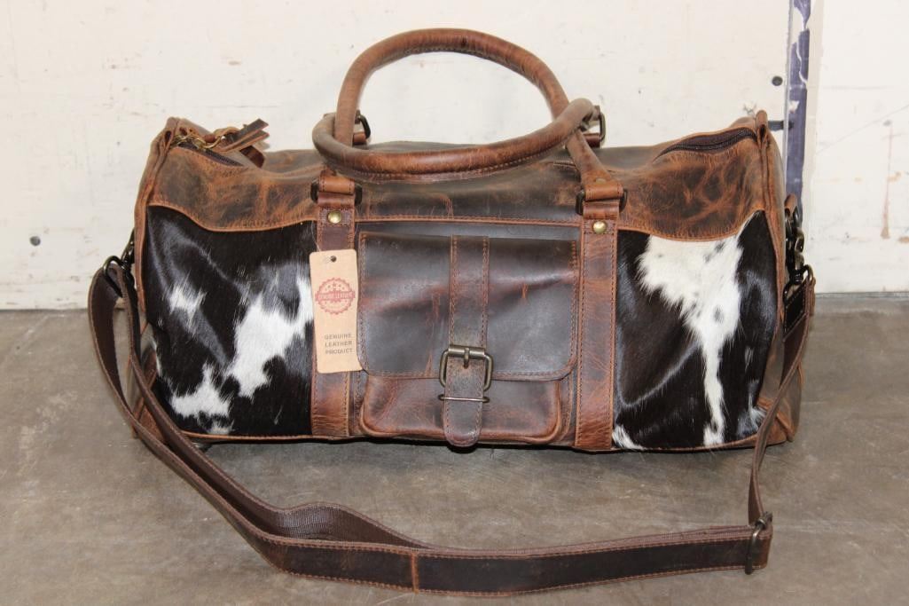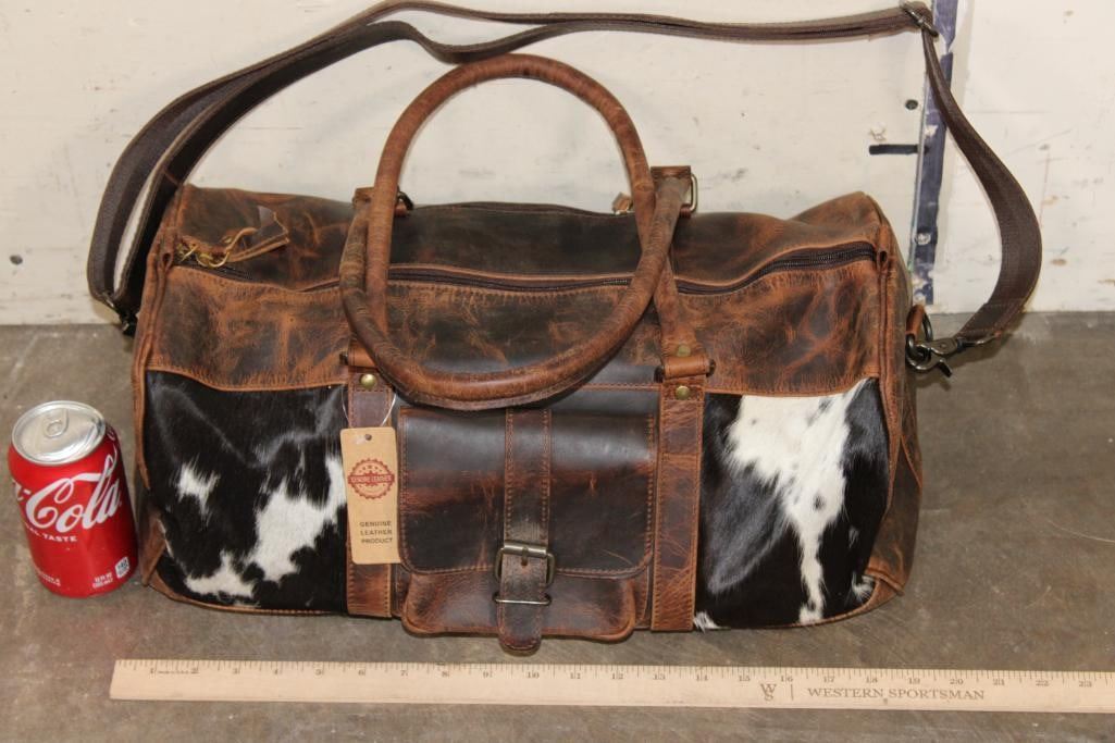 *Brand New* Cow Hide and Brown Leather Duffle Bag. It measures 18" Long x 10" Wide x 9" Tall. WESTERN TRAVEL BAGS
