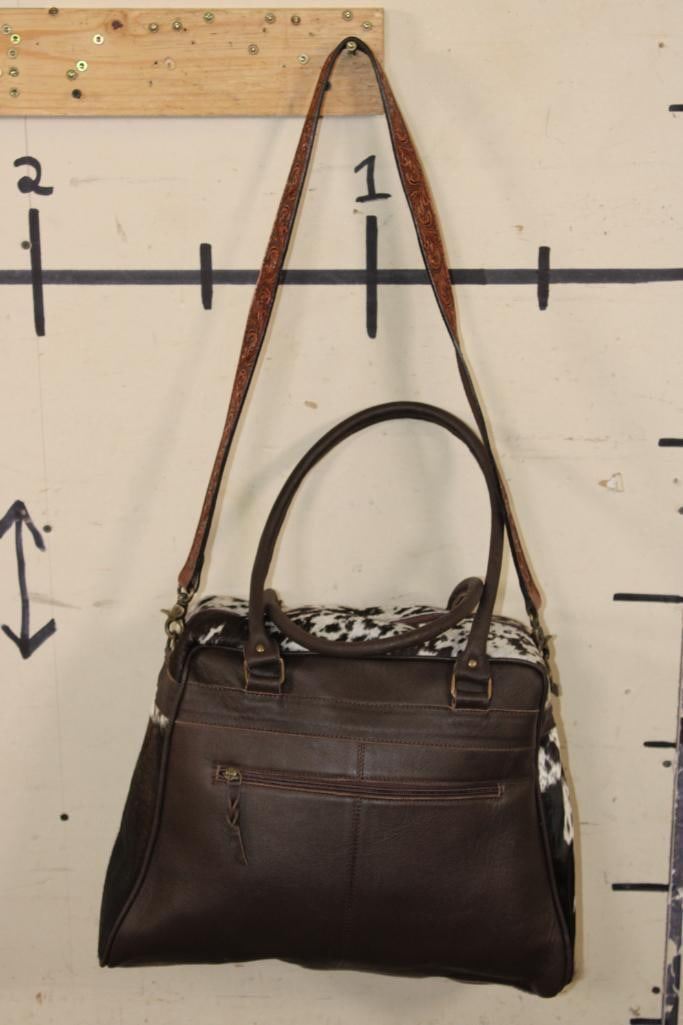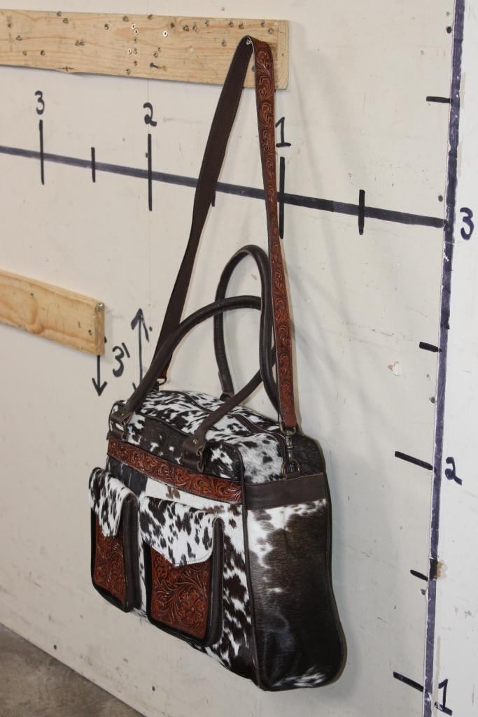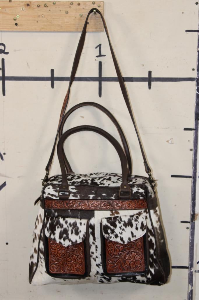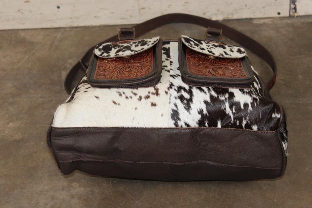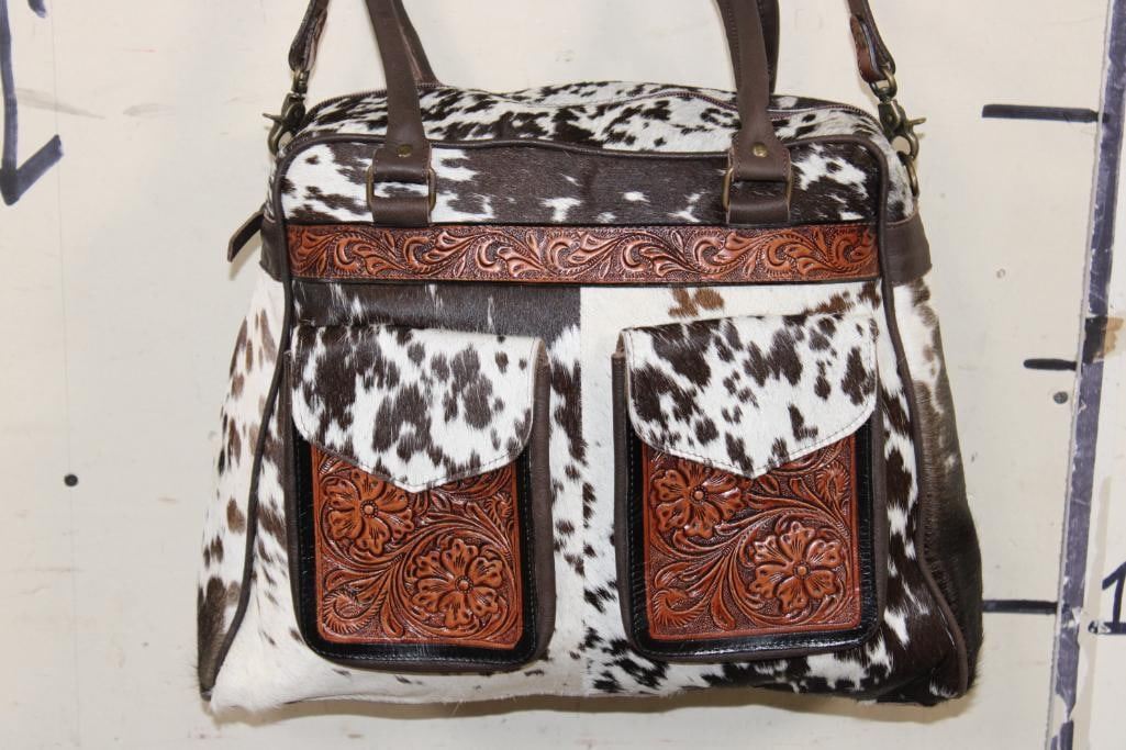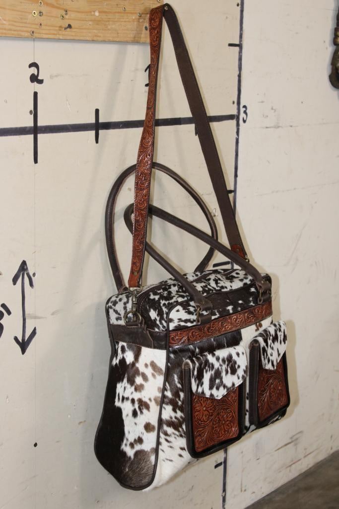 Beautiful *Brand New* Salt and Pepper COW HIDE Leather Bag with tooled details. It measures 17" Long x 7" Wide x 13" Tall and has a removable carrying strap. You can carry this as a purse or use it as a work bag. WESTERN BAGS AND PURSES