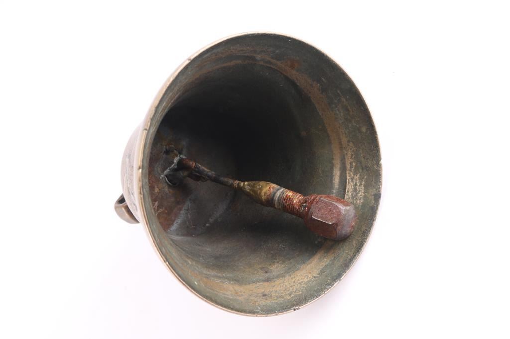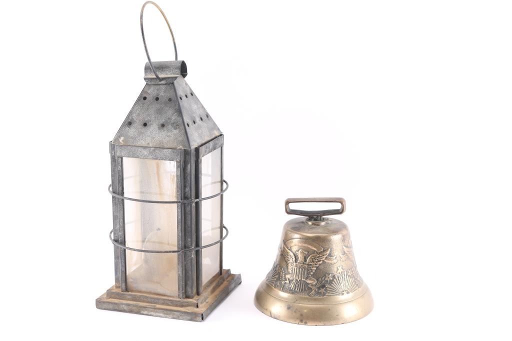Patio decor: brass bell with eagle and shield emblem, measures 6" tall by approximately 6" across. Good condition. Tin with glass kerosene lantern, has one glass panel missing. Measures 15" tall and 5 1/2" by 5 1/2".