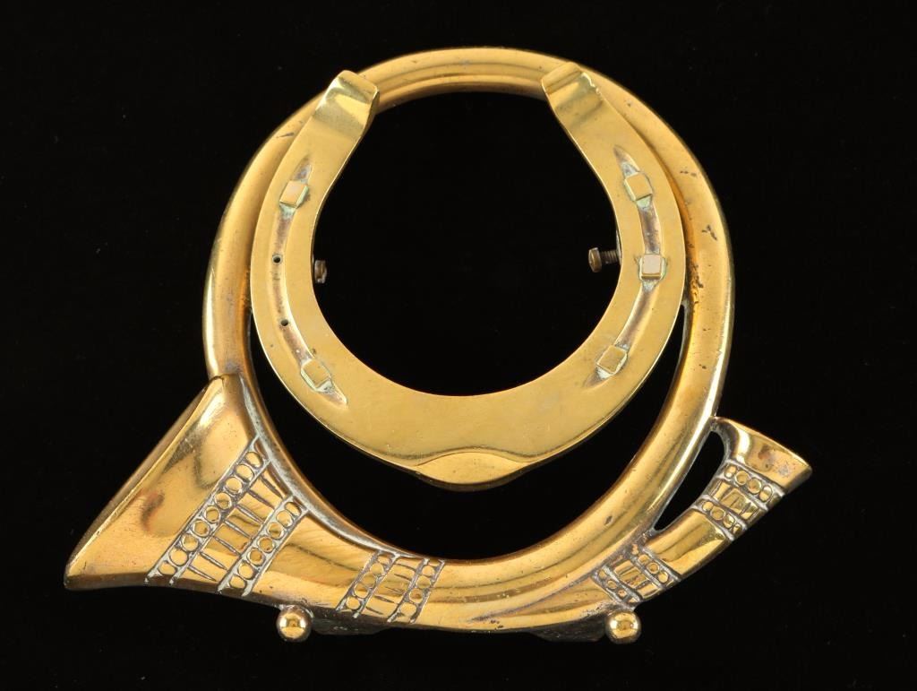 Upturned horseshoe surrounded by a hunting horn with stand for display. Measures 4 1/2" x 5".