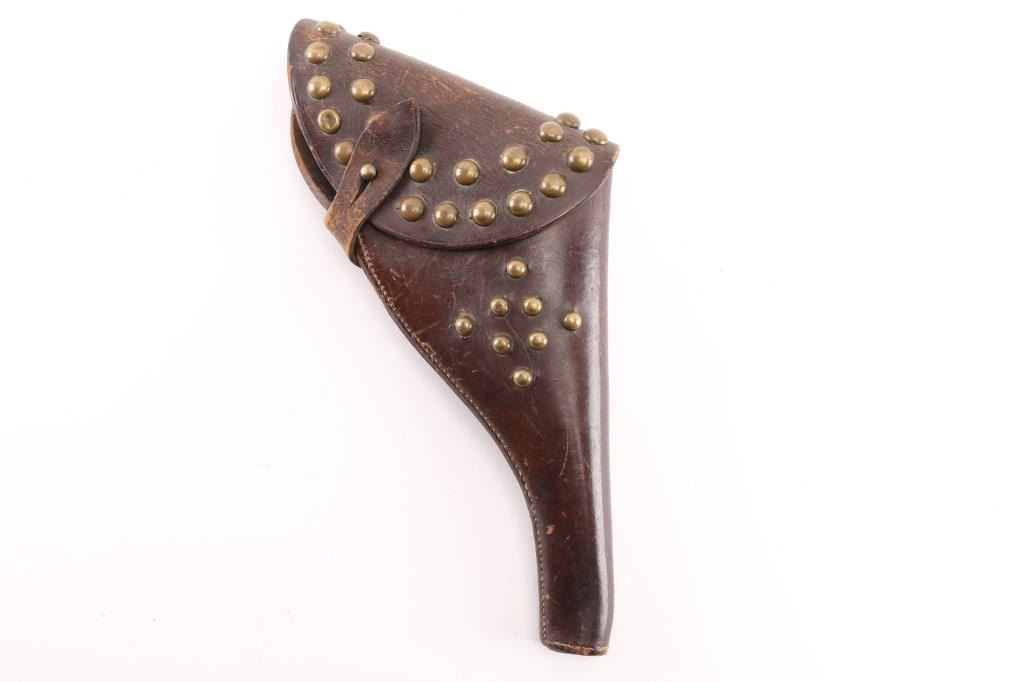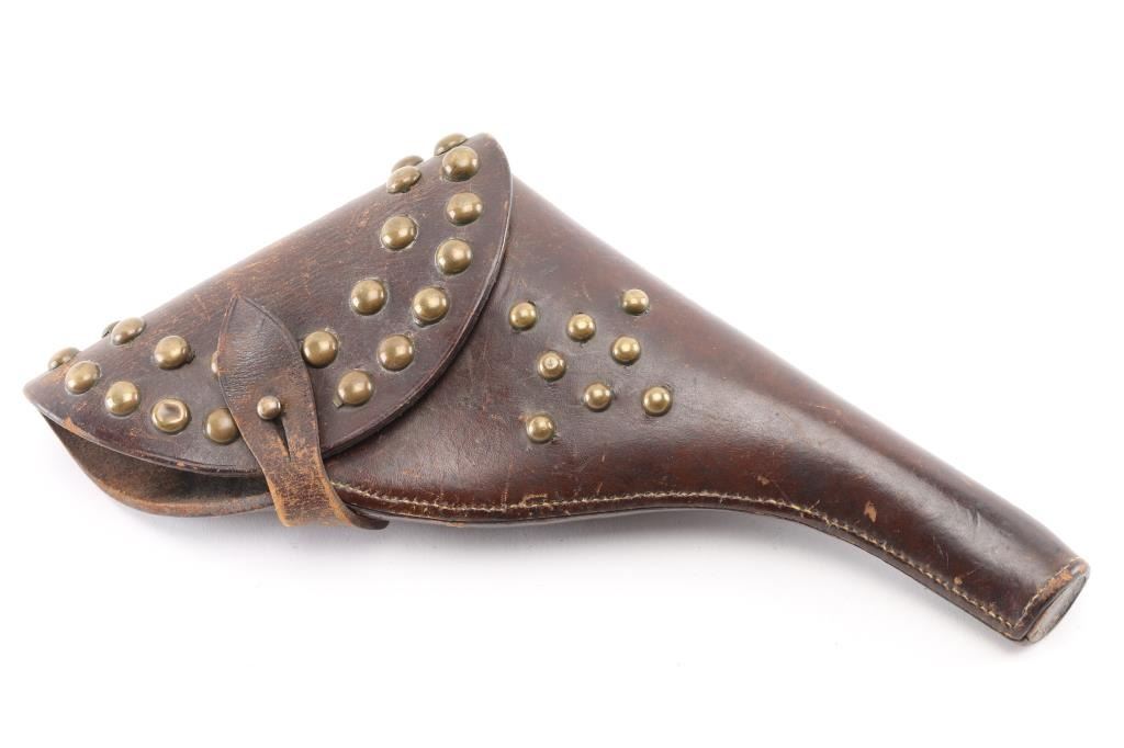 "Private Purchase" British Infantry Officer's flap holster for the .455 Webley revolver. Era of World War One. (1914 - 1918). Made of top quality Cow's leather in brown fitted with broad belt loop to rear as well as brass attaching hoop for Sam Browne cross straps. The flap and front of the holster has been decorated with brass tacks which appear to have been on there a long time. Very good condition.