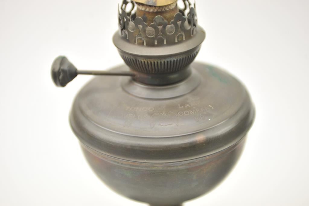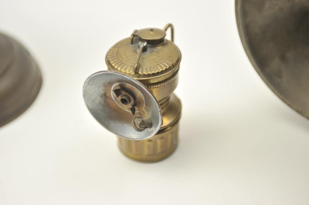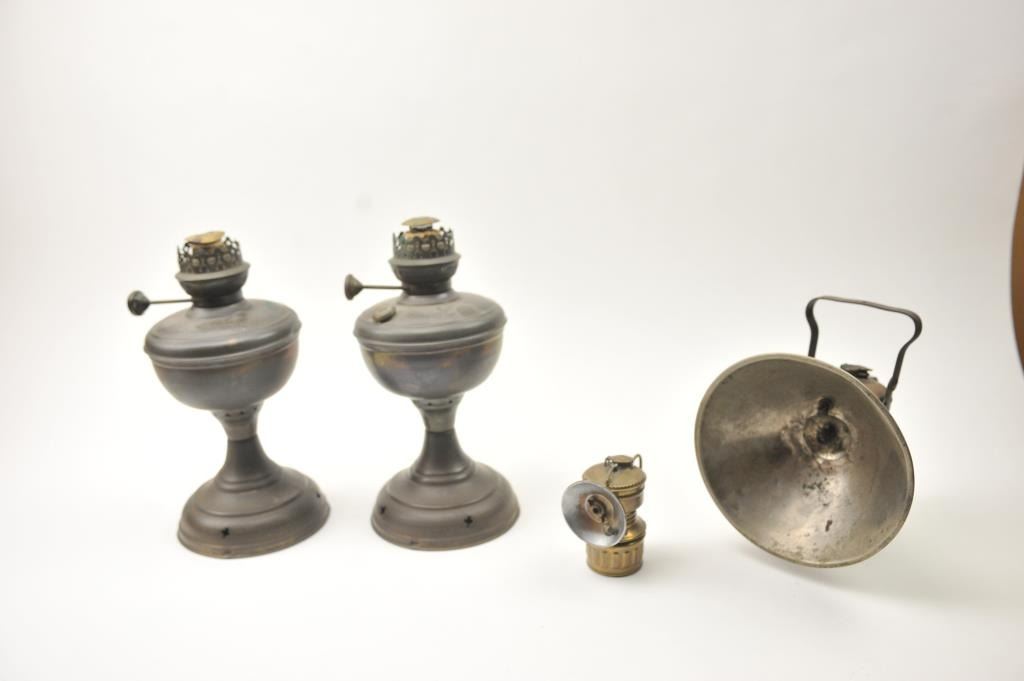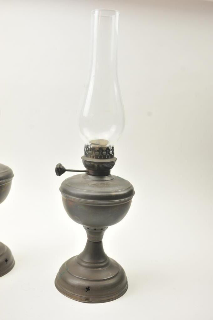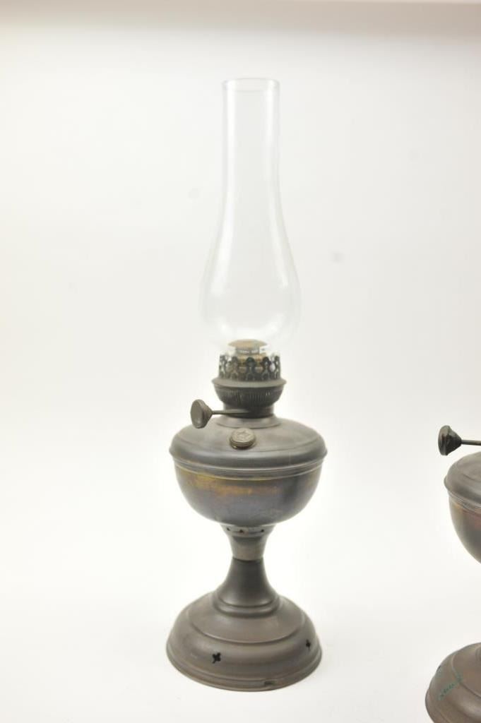 Brass kerosene lamp marked Lovell & Company decorated with an American Eagle and Star decoration with flutes. The lamp is 20 ½” overall with a brass base measuring 11 ½”, dated 1888. Additionally, a 19th centurybrass kerosene lamp with flutes, mid-19th century miner’s type hand lamp (Just Right, USA), Guy’s dropper-7-21-25 Patent Miner’s lamp by Shanklin, Springfield, Mass, USA. Est.: $200-$400.
