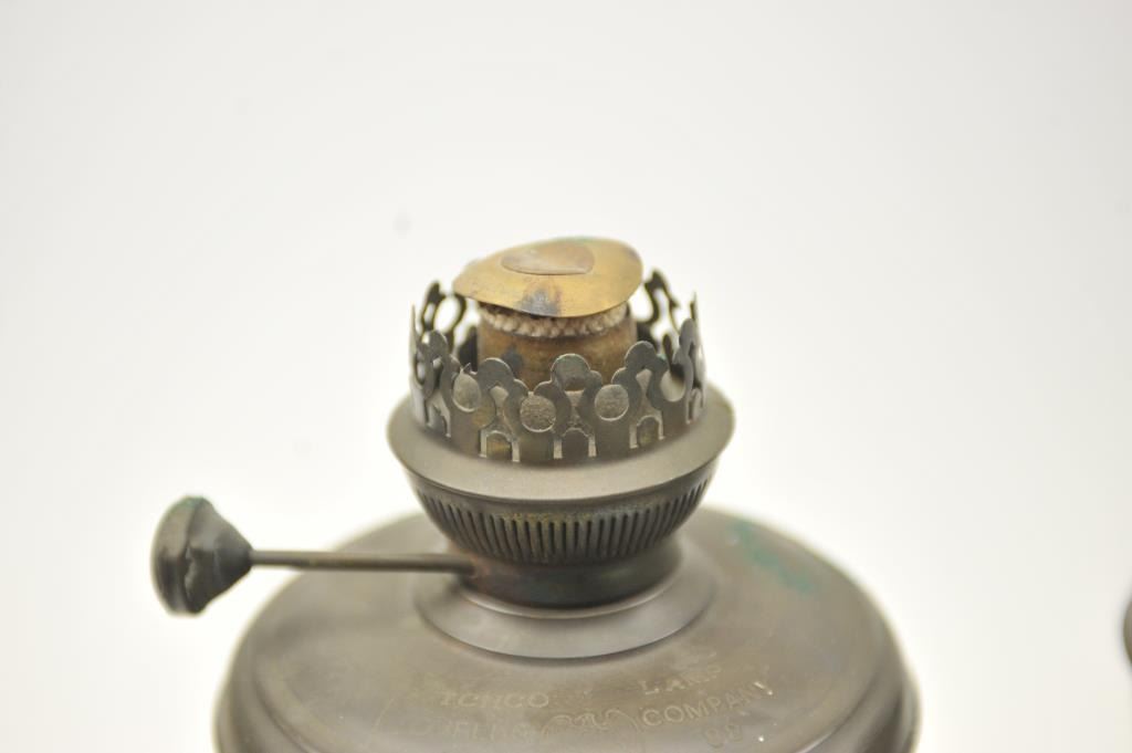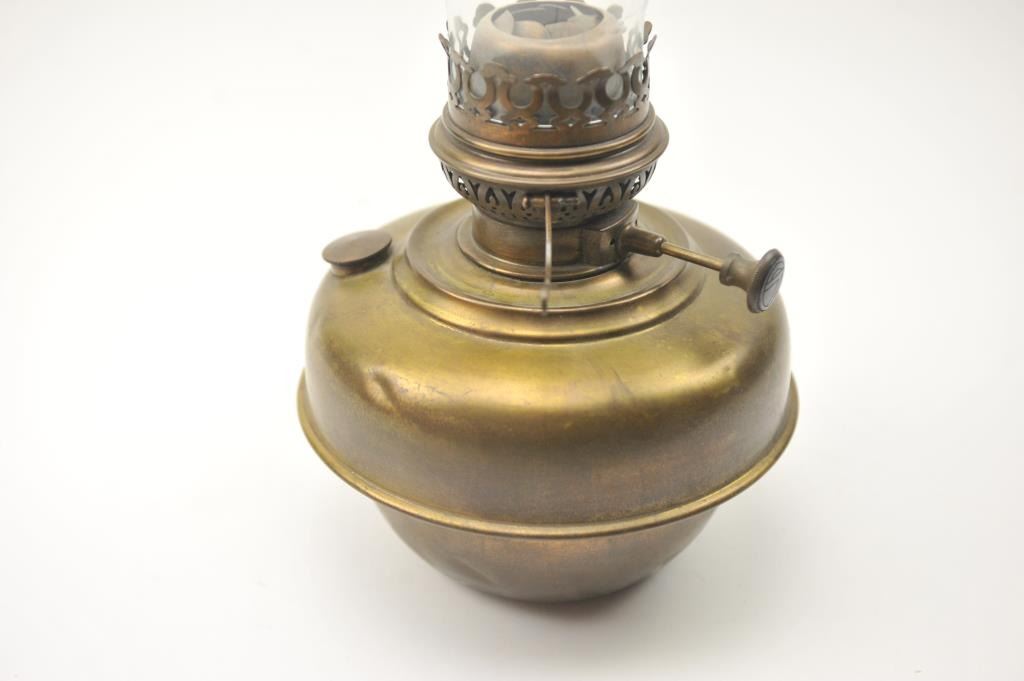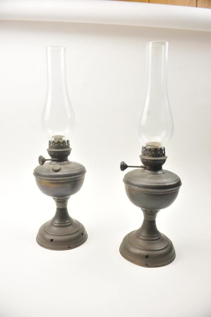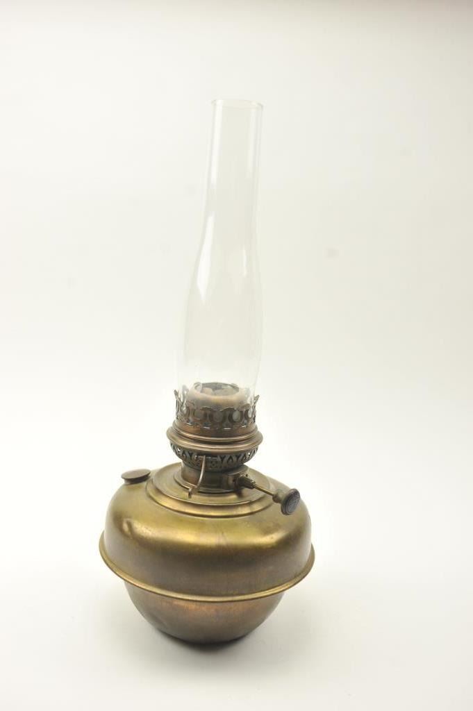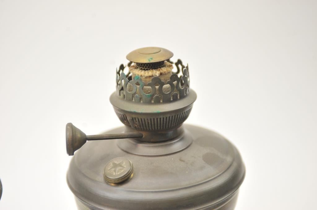 Brass kerosene lamp marked Lovell & Company decorated with an American Eagle and Star decoration with flutes. The lamp is 20 ½” overall with a brass base measuring 11 ½”, dated 1888. Additionally, a 19th centurybrass kerosene lamp with flutes, mid-19th century miner’s type hand lamp (Just Right, USA), Guy’s dropper-7-21-25 Patent Miner’s lamp by Shanklin, Springfield, Mass, USA. Est.: $200-$400.