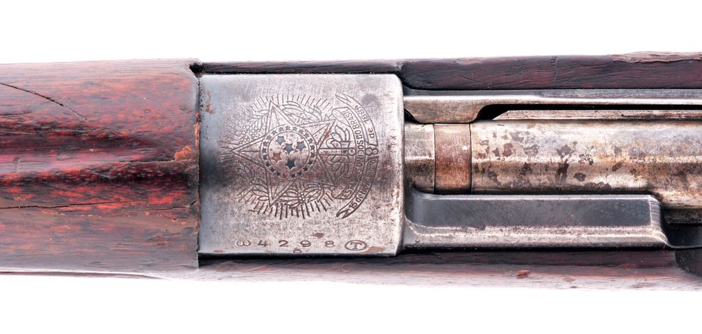 Brazilian Mauser Model 1908/34 Bolt Action Rifle, #4298P, 7x57mm, 21.5'' barrel, blue finish, hardwood stock, inverted ''V'' front sight with guards, ''V''-notched tangent rear sight, hooked front band, with dual rear swivel. No cleaning rod. Receiver ring with ''Brazilian National Crest''; mfg'd by CZ and marked on the left side of the receiver. Numbers do not match. Import marked on the underside of the barrel. Condition is fair. Less than 20% blue finish remains; metal is a combination silvery gray with some dark spotting. Small parts with areas of surface rust. Wood with oil darkening, scattered surface dents and scratches. Upper handguard with a hairline crack near the rear sight. Good action; dark frosted bore with good rifling. Est.: 150-$250. (C&R)