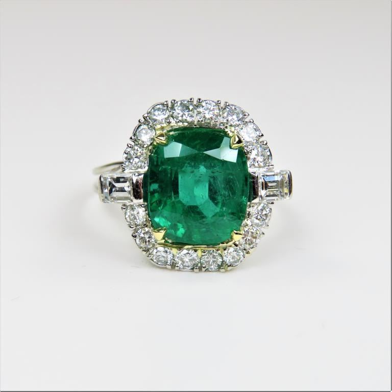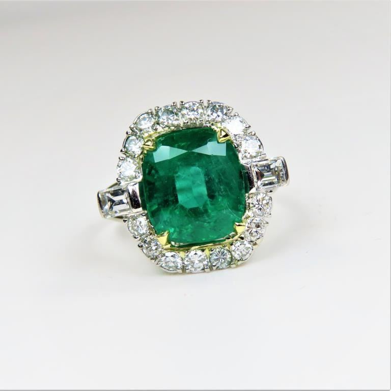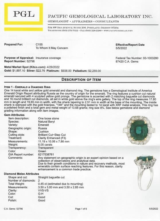 Gorgeous EXTRA FINE 6.05 carat Emerald and Diamond Ring featuring a Rare G.I.A. Certified RUSSIAN Emerald with superior color and very good clarity framed with 16 round and 2 emerald cut Fine Diamonds weighing approx. 1.19 carats with G/H colors and VVS/SI clarity set in a glamorous Old Hollywood style vintage setting crafted in 14 karat white gold. Large Fine Quality Russian Emeralds are no longer mined and only found in quality antique jewelry of the famed Faberge Era of the late 1800s-early 1900s. Once in a Lifetime Jewelry Collectors Piece. Full Appraised Value - $51,800.00