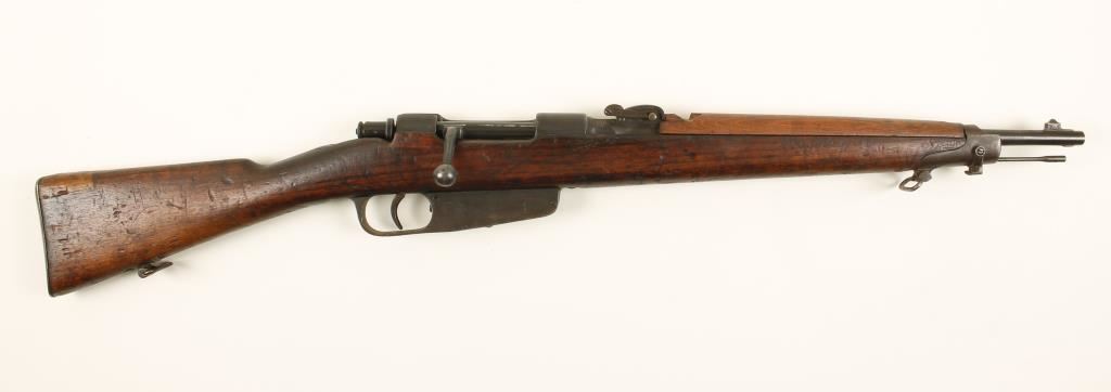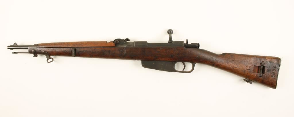 Italian military bolt-action rifle with a 18" barrel. Dated 1916 and stamped "Brescia". Shiny bore with strong rifling. Bluing is worn and dull with edge wear and light pitting. Action works. Stock is soundly battered with replacement handguard and the heel of the butt. Number stamped in stock matches serial number. Condition is fair. *Modern Firearm*