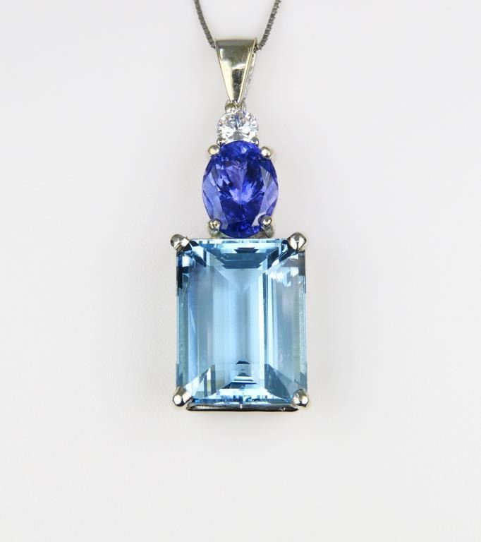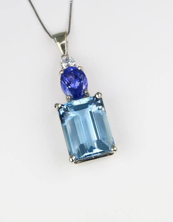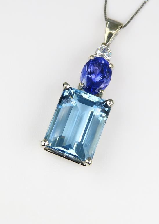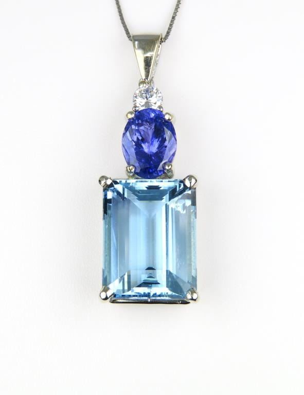 Pendant featuring a G.I.A. Certified Emerald cut Aquamarine weighing 10.75 carats and a vivid oval cut Tanzanite weighing 2.00 carats accented with a fine round Diamond with F-G color and VS clarity set in an 18 karat white gold custom setting. Retail $10,000-$15,000