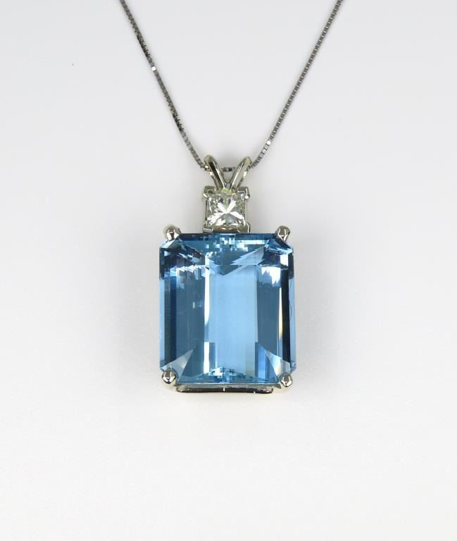 Pendant featuring GI certified emerald cut Aquamarine weighing 16.09 carats accented with princess cut diamonds weighing approx 0.46 carat with H-I color set in custom 14karat white gold setting. Full retail appraisal 14,5000.00