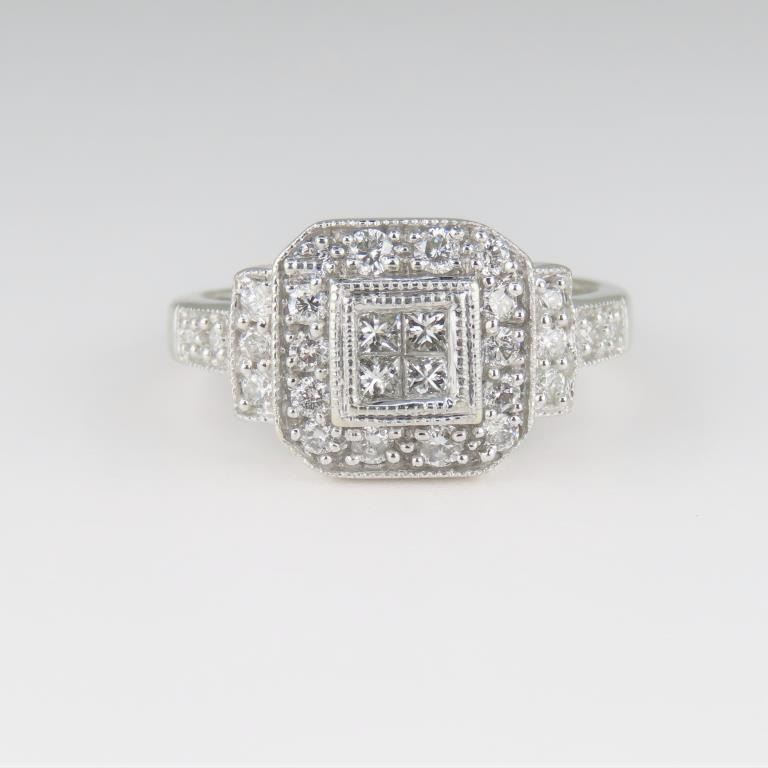 featuring 4 Princess cut and 24 round cut Diamonds weighing approx. 0.80 carats with F-G colors and VS clarity set in a 14 karat white gold setting.