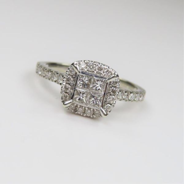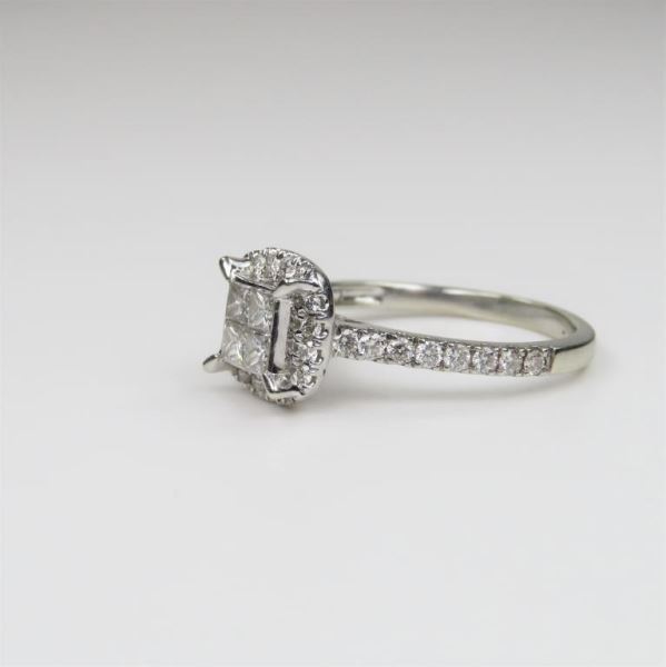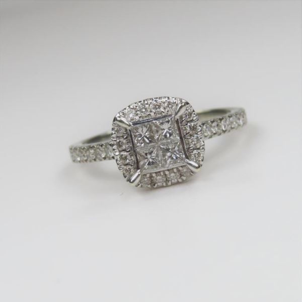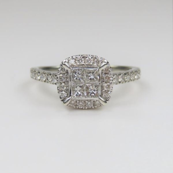 featuring 4 invisible set Princess cut Diamonds accented with 32 round cut Diamonds with a combined weight of approx. 1.20 carats with F-G colors and VS/SI clarity set in 10 karat white gold.