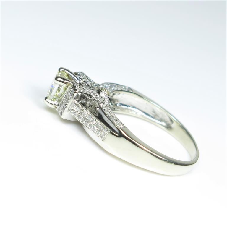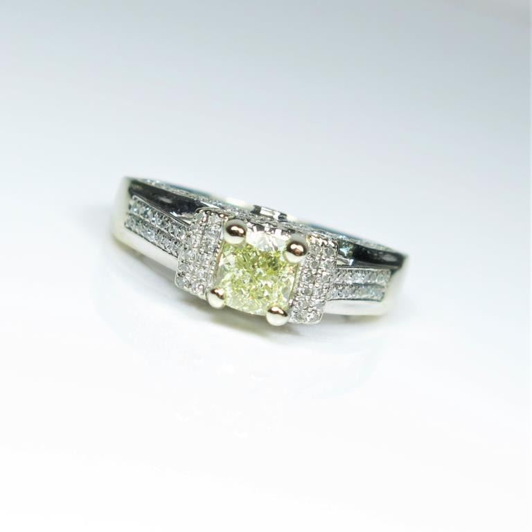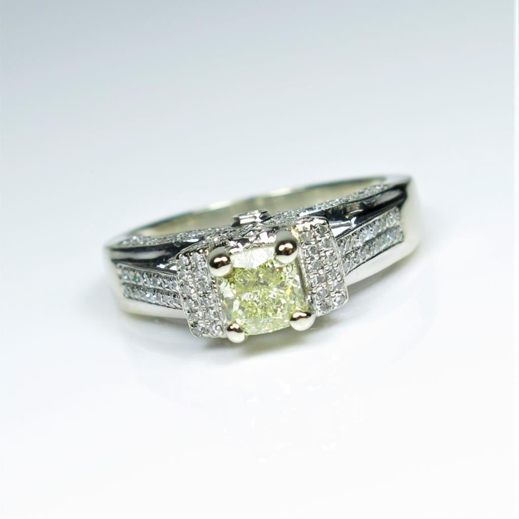 Brilliant Fine Fancy Yellow and White Diamond Ring featuring a light fancy cushion cut Yellow Diamond weighing approx. 0.72 carats with VS clarity with over 142 round cut Diamonds weighing approx. 1.00 carats with F-G colors and VS clarity set in 14 karat white gold. Retail $4,000-$5,000