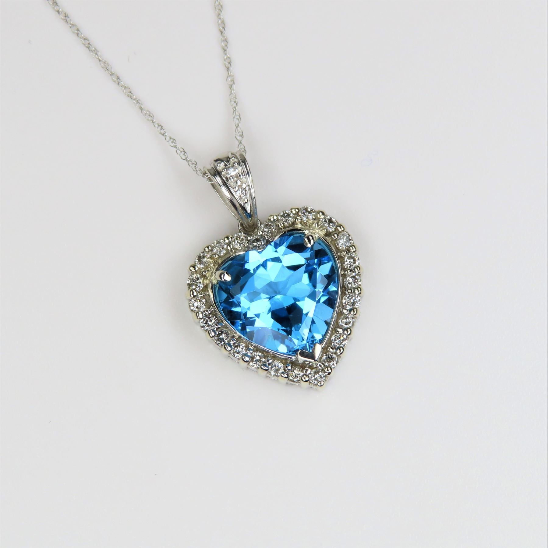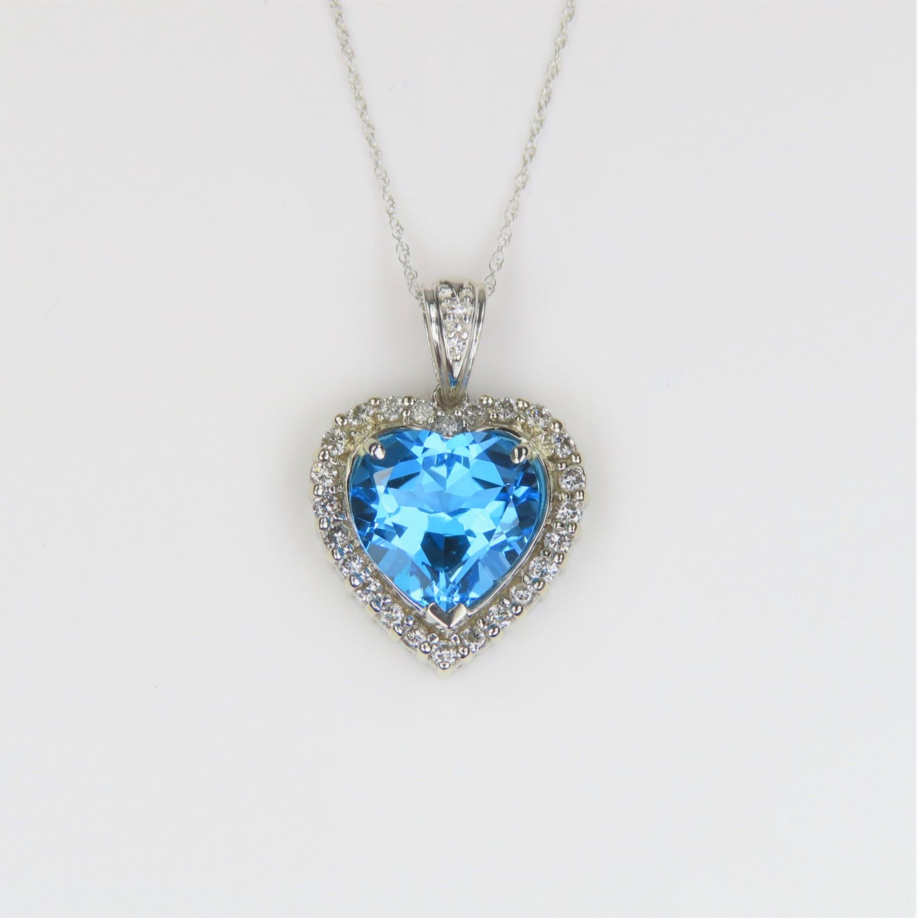 featuring a vibrant Blue Topaz weighing approx. 7.00 carats framed with 24 round Diamonds weighing approx. 0.40 carats with G-H colors and SI clarity set in 14 karat white gold.
