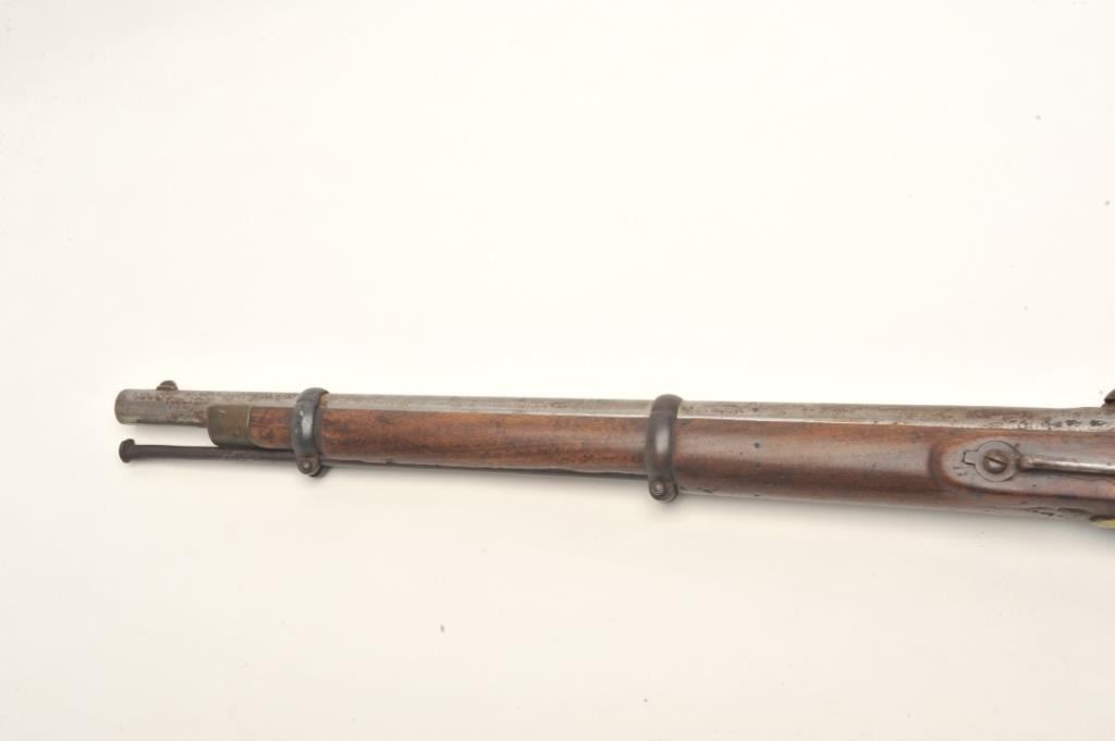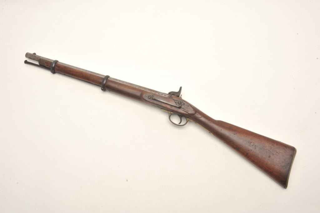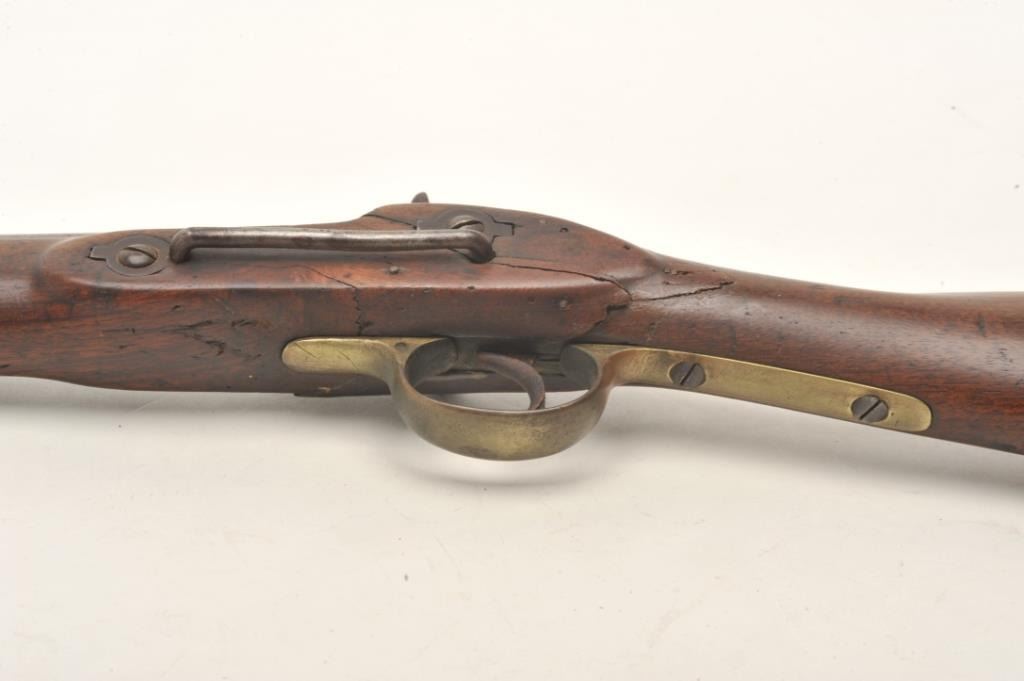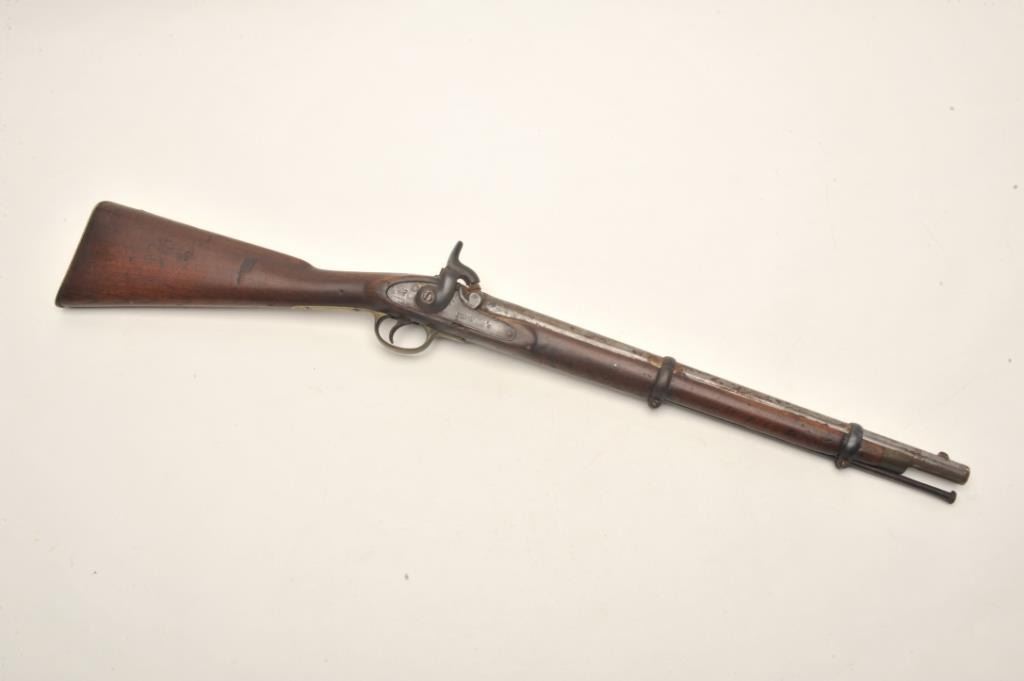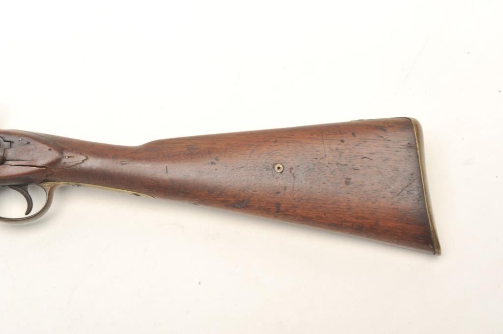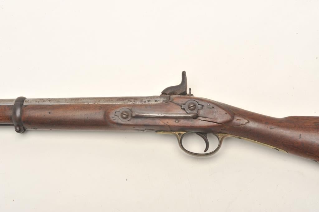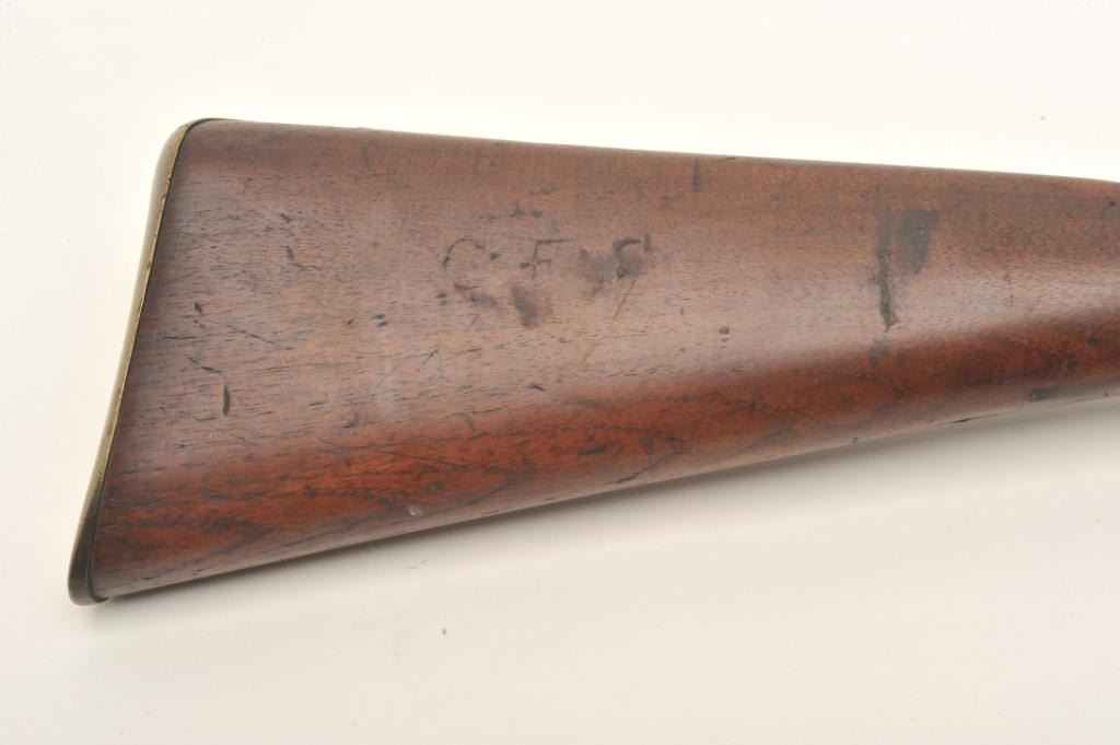 British Barnett percussion single shot short rifle, .65 caliber, 21” barrel, iron ramrod, wood stock, Tower marking with crown on back end of lockplate, overall fair condition displaying a light patina on barrel withscattered areas of erosion, brown patina on lockplate and hammer, good action, dark bore, wood stock shows wear and repaired breaks on left side at saddle ring bar/front of wrist; concentric circles drawn on left side ofbutt stock with small brass inlay in center; old carving “C.F.O” on right side of butt stock; brass trigger guard and butt plate. (Antique). Est.: $300-$600.