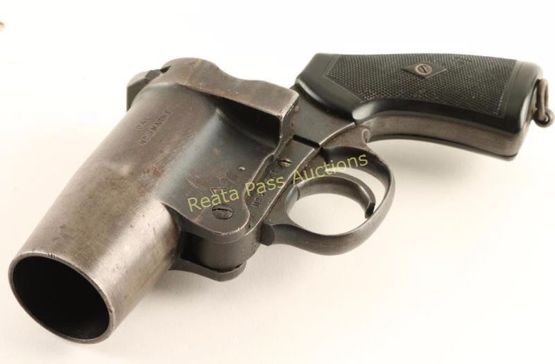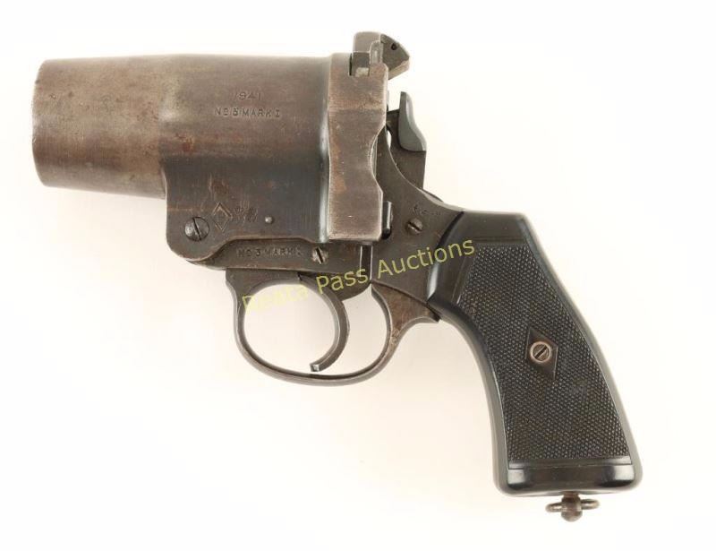 No. 3 MKI 37mm flare pistol. All metal construction with molded plastic checkered grips. Stamped '1941' with makers marks just under left side of barrel.