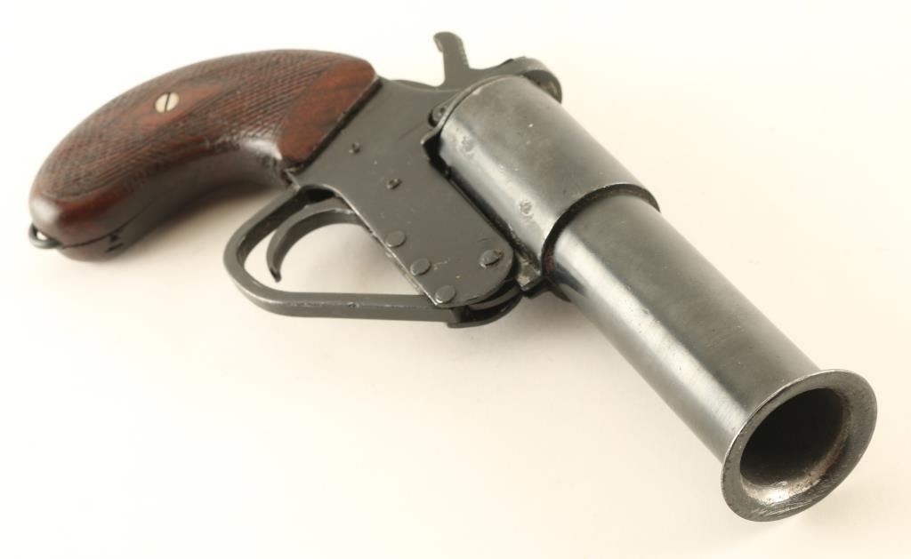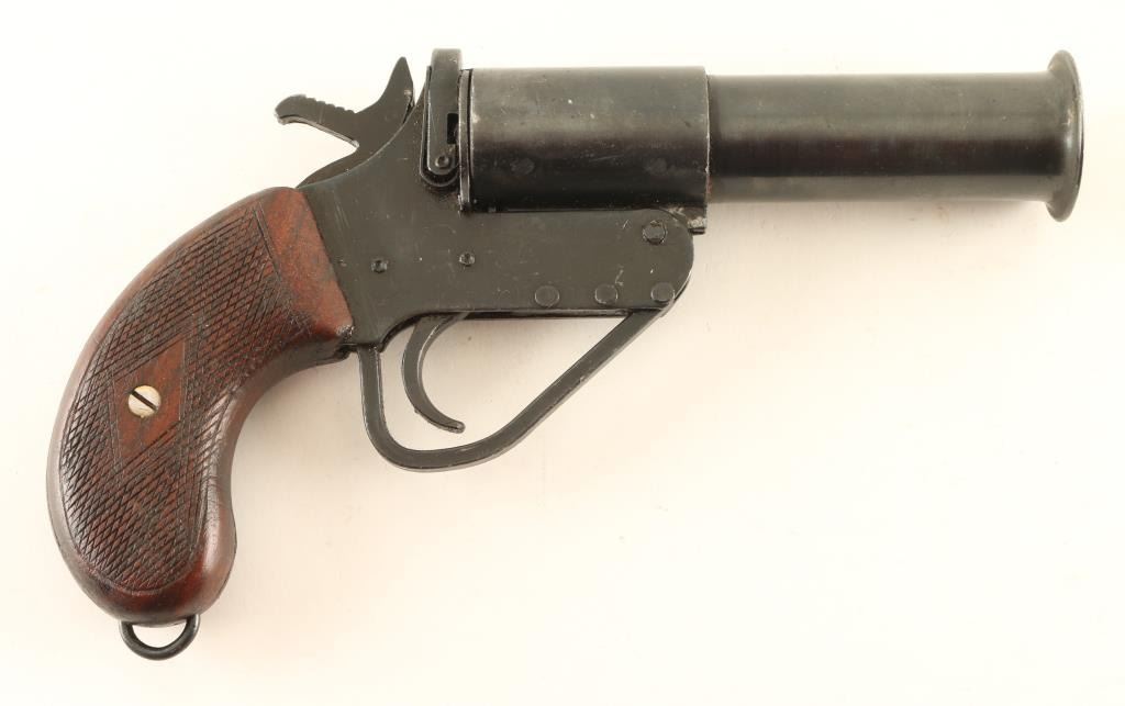 #151508 British flare pistol features 5.75" top break barrel with "blunderbuss" styled muzzle, single action, lanyard ring, cross hatched wood grips. Bore is fair to good condition with some pitting and roughness. Retains 85% blue, possibly a re-blue, with bare metal at sharp edges and scratches. Grips are good condition with some chips out at rear top. Lightly struck proof on barrel top. Overall condition is Very Good.