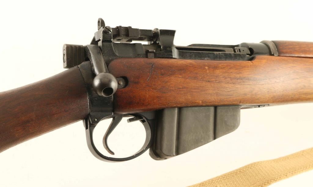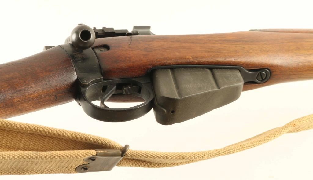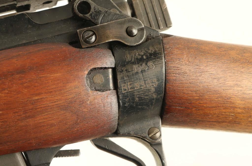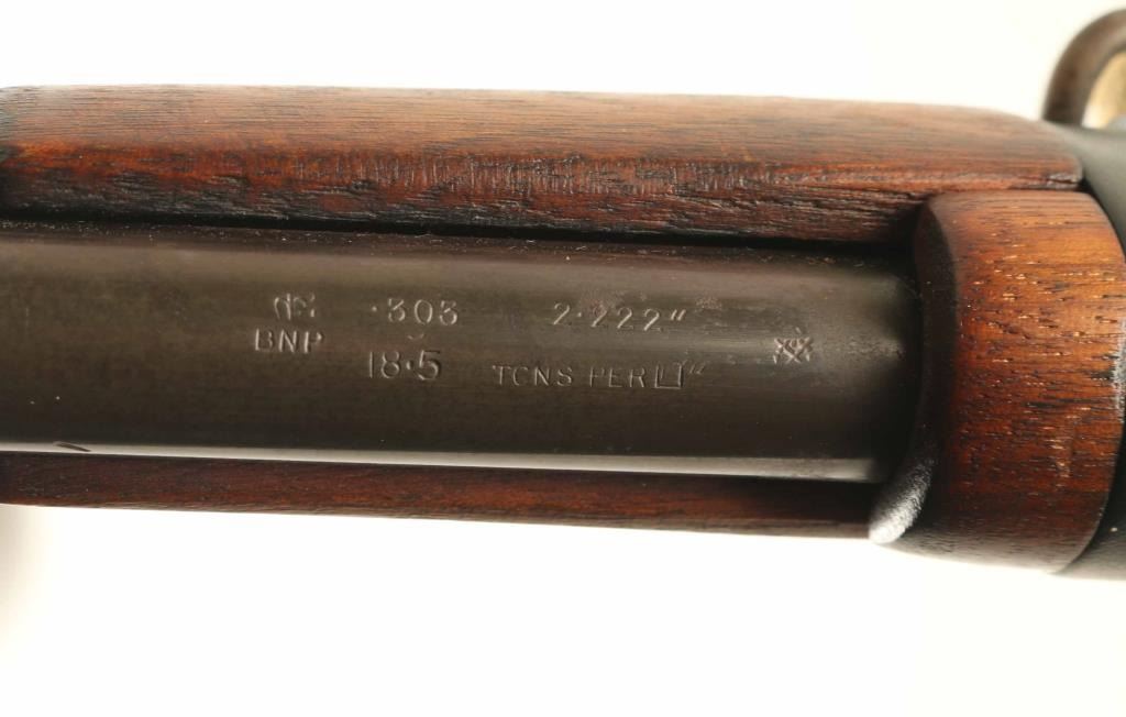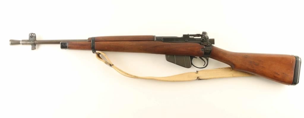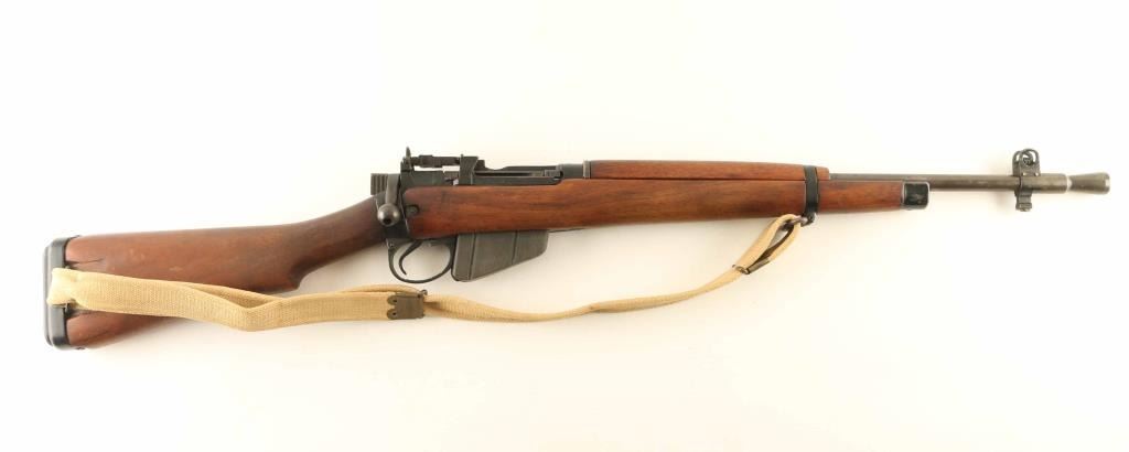 'Jungle Carbine' WWII era British military magazine fed bolt action service rifle chambered in .303 British, dated 1945. No import marks observed. Features a black painted finish, 20.5" barrel, pinned front sight base with protective sight ears, cone style flash suppressor & bayonet lug, dovetailed patridge front sight, receiver mounted folding aperture sight graduated to 1300 meters, smooth trigger, manual safety on the left side of the receiver, 10 round detachable magazine, sling points, hollowed bolt handle, 'lightening cuts' on the receiver & barrel, steel buttplate with rubber recoil pad, and three-piece smooth wood stocks. Mismatched bolt. The left side of the receiver is marked "No5MK1” and the left side of the butt socket is stamped “ENGLAND M/4 1945 BE3333”. Nitro proofs on barrel are crisp. Bore is very good condition. Rifle retains approximately 40% of its black painted finish, mostly on the action, with barrel and flash hider displaying a smooth even grayish color. Magazine appears parkerized with a dull chalky gray color. Wood is good condition, lightly sanded & refinished, fair fit to metal at butt & band. Handguard is slightly loose. Includes good condition tan cotton web sling. Condition is NRA Good *** C&R Firearm ***