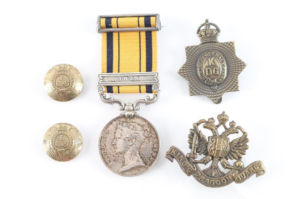 South Africa medal with 1879 bar to Pte B. Ellis, 1st (King's) Dragoon Guards 1347. The King's Dragoon Guards were sent to Zululand following the Isandlwana disaster and served in a number of capacities throughout the war. They were present at the discovery of the body of the Prince Imperial on 2 June 1879, were extensively employed on the lines of communication, and one squadron took part in the charge at Ulundi. A detachment of Dragoons captured King Cetshwayo on 28 August 1878.Participants in the Zulu War received this medal without a bar if they remained on the Natal side of the Tugela, or with the bar '1879' if they actually saw service in Zululand. Medal in good condition, no obvious knocks or scratches. Top Clasp is hallmarked. Comes with KDG double headed eagle cap badge. (Not Period} The King's Dragoon Guards 1916 Brass Economy WW1 cap badge. For display. From the Joe Musso Collection.