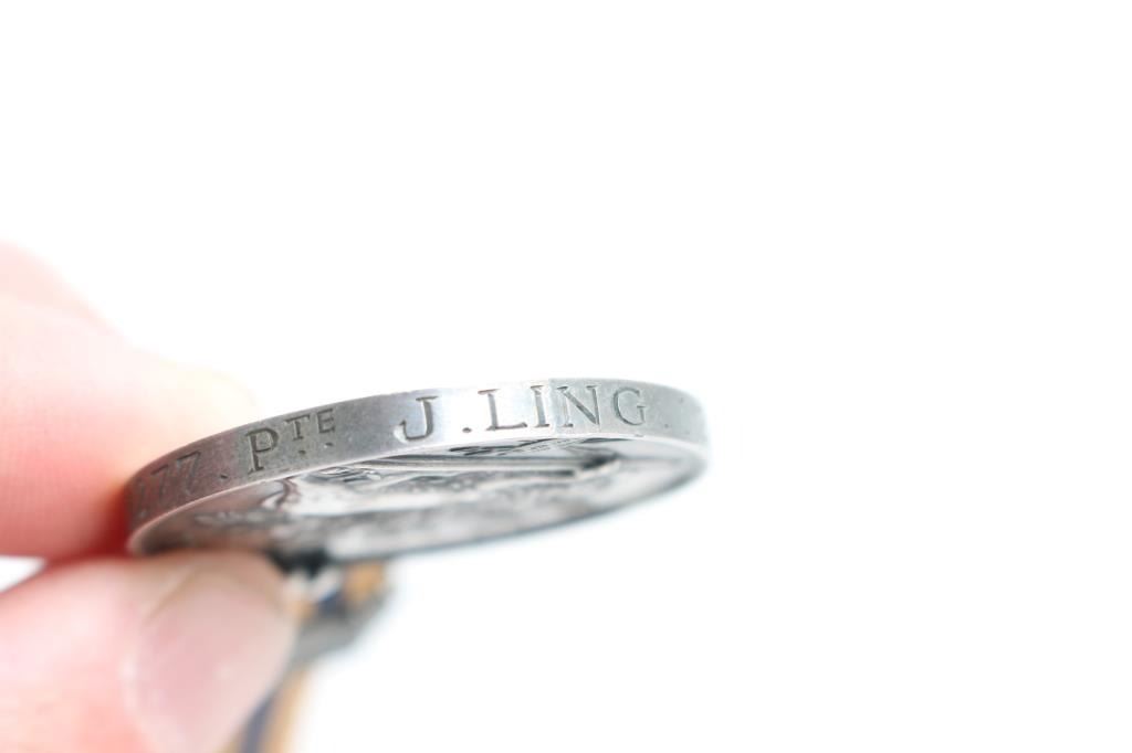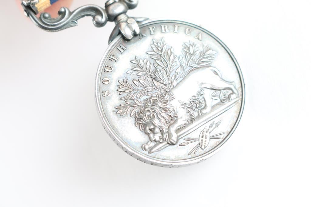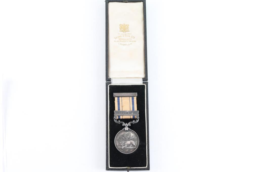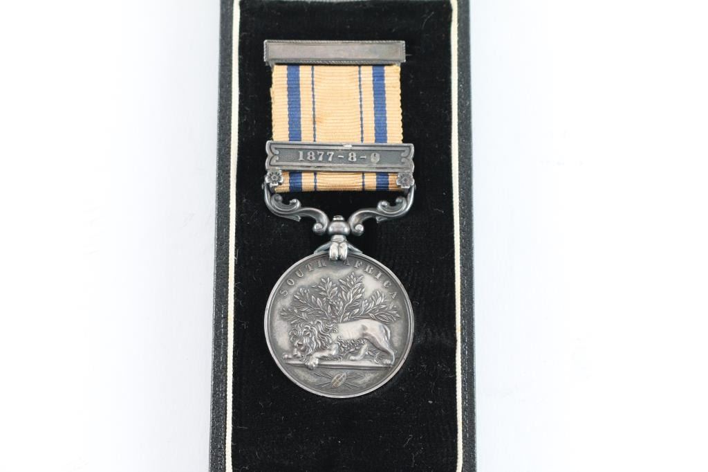 Extremely rare cased British South Africa, 1877-8-9 Medal to Pvt. Jason Ling. 1st Battalion, 24th Regiment of foot. South Wales Borderers. Pvt. Ling was killed in action at the camp, Isandhlwana Hill, Zululand, on January 22nd. 1879. (Documentation Included). The side of medal is stamped "1277 Pte J.Ling. 1/24 Foot."He is listed in the KIA casualties list as "Jas. Ling 1277". He was one of 727 British regulars killed that day along with 52 Officers. The battle is considered the biggest blunder in British military history. The medal comes in it's original dark blue leather box, form fittied for medal. The inside lid, embossed in gold is "By Appointment. Spink & Son Ltd. Medallists to his Majesty the King. London S.W." Medal and ribbon are fine with a nice patina, box is excellent. A very rare opportunity to own a great piece of military history. His complete records are available through the British Government.