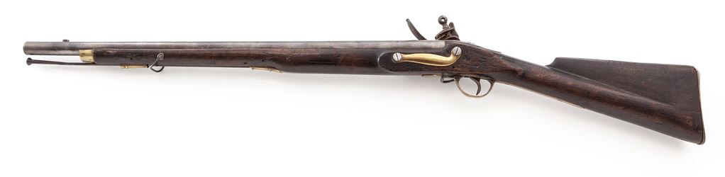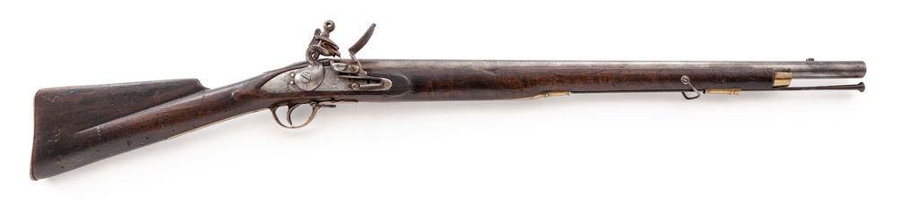 British Tower Pattern 1793 Flintlock Musket Shortened to Musketoon Length, NVSN, approx. .75 cal., 27.5'' smoothbore round barrel with proofs and a ''Broad Arrow'' acceptance mark at breech. Lockplate stamped ''Tower'' in a vertical curve behind cock and with the George III cypher and ''(Crown) / Broad Arrow'' Ordnance stamp beneath the pan. Appears to be in original flintlock configuration. Brass serpentine sideplate, triggerguard, buttplate and two ramrod thimbles; replacement brass forend cap, single iron sling swivel and iron ramrod, and walnut fullstock. Condition is good as modified showing cleaned pitted iron surfaces having light age toning and polished brass. Stock with missing sliver on right side along the barrel, age scratches and dings. Est.: $650-$950. (Antique)