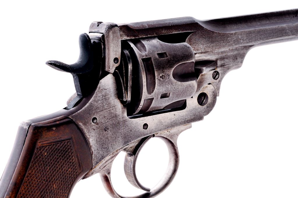 British Webley Mark VI Double Action Revolver, #184573, .45 ACP cal., 6'' barrel, blued finish, vulcanite plastic grips, blade front sight and ''V''-notched rear sight. Marked on left side of frame ''WEBLEY MARK VI PATENTS 1915'', and on left side barrel extension ''MARK VI'', along with Birmingham proof and inspection stamps, and a '''15'' in-service stamp. Converted to .45 ACP by ''shaving'' rear of cylinder. Matching numbers on frame, barrel and cylinder. Condition overall is good with almost none of the finish remaining on metal surfaces, which has turned to a brown patina in several places. Hammer is noticeably darker and may be a replacement. Grips have turned brown and show flattening and light scratches and are very good overall. Bore has slight discoloration but is overall very good with very good rifling. Chambers have some light discoloration but are otherwise clean. Action locks up and indexes smoothly. No visible import stamps. Est.: $450-$650. (C&R/PPT) (Joe Poyer collection)