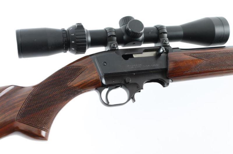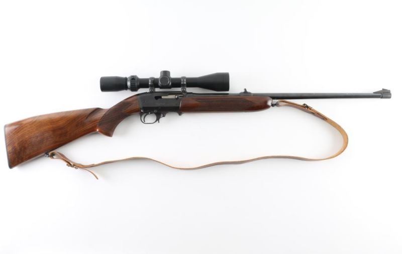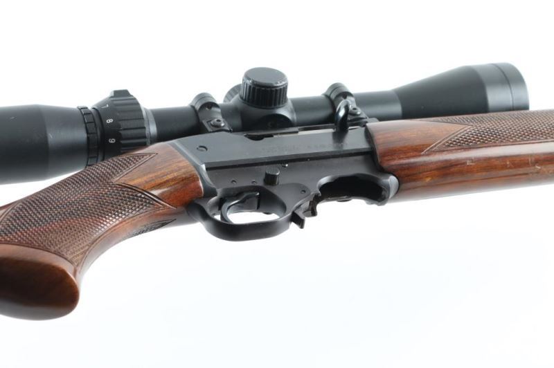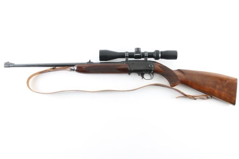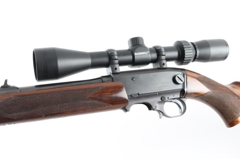 Collectible Czech made semi-automatic takedown rifle chambered in .22 Magnum. Features a blued finish, 20.5" barrel, ramped front sight, dovetailed rear window sight, smooth trigger, integral scope rail cuts on receiver, sling swivels, push button safety, checkered wood forend and wrist, pistol grip shoulder stock with factory buttplate. The metal finish looks very good with only one scuffed spot on the barrel about 1" long 4" from the muzzle top right. Wood stocks look good with only minor signs of use and wear. Comes with leather sling and a Bushnell 3-9x40 scope with rings. Optics are clear. There is NO Magazine. Condition is NRA Very Good