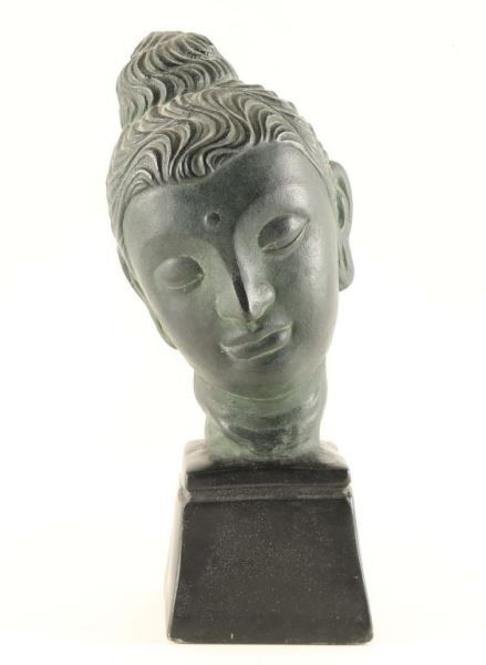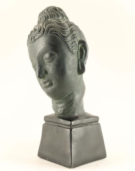 of Indian Buddha head, marked with tag that reads Museum Pieces INC reproduction. 11X3"