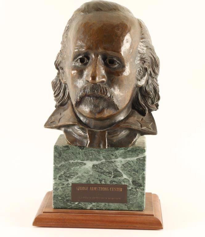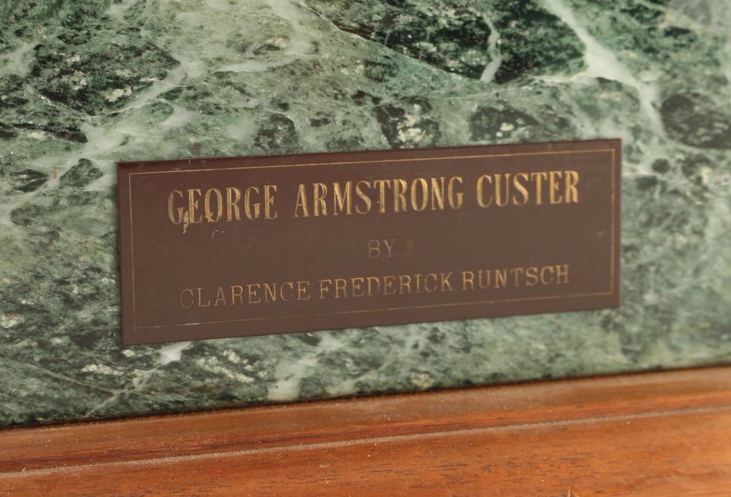 Clarence Frederick Runtsch sculptor. Bust has the notorious moustache and wavy hair of the famed General. Sits on green marble base with plaque that reads 'George Armstrong Custer By Clarence Frederick Runtsch' Signed 'Runtsch 1982' and copyrighted on back. Measures 7 1/2"x13 1/2"x7".