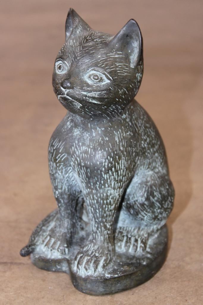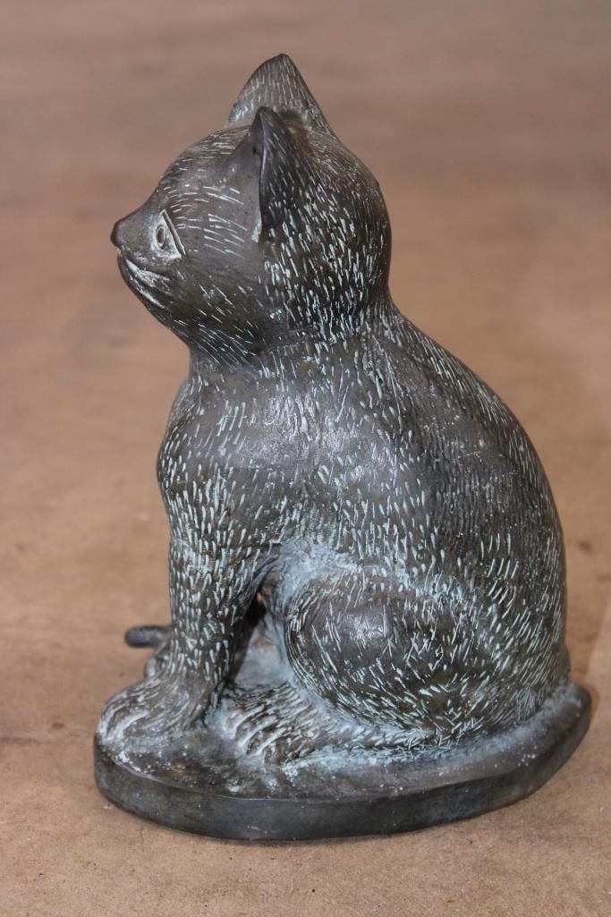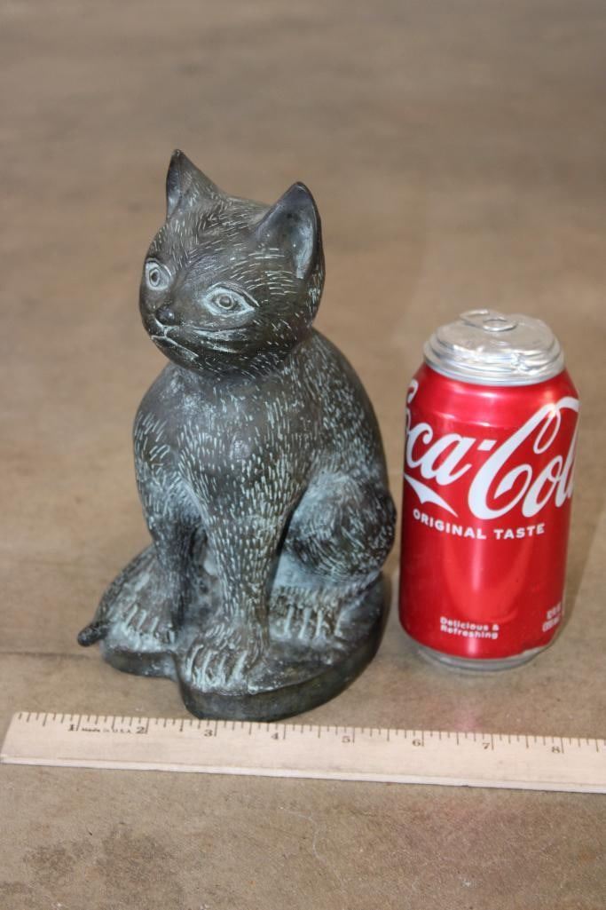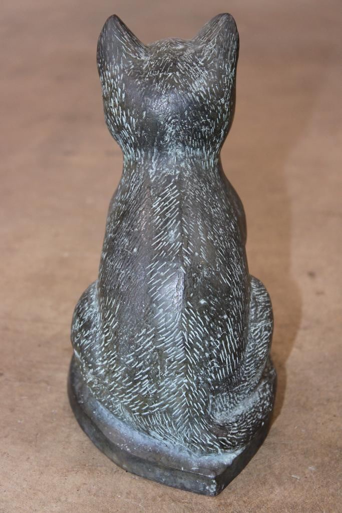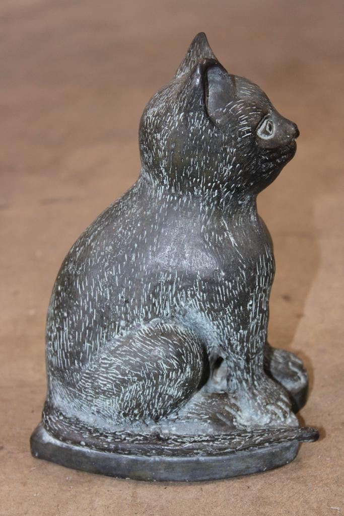 Bronze CAT Sculpture. It measures 6" Long x 4" Wide x 8" Tall. The Total Weight is 3 lbs 6 oz. COLLECTIBLE BRONZE SCULPTURES AND STATUES