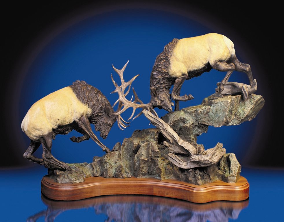 Lorenzo Ghiglieri spent months observing the great herds of North American elk migrating from serene valleys to wild rivers. “Primitive Force” attests to the impression these creatures made upon him. This magnificent sculpture of rutting bulls in combat represents a classic moment in the lives of male elk, enacted over and over again in their battle for supremacy. This sculpture is 22 inches tall, 44 inches long and 17 inches wide and has been appraised at $32,000 and comes with a certified appraisal of the value. This bronze is on display at the podium.