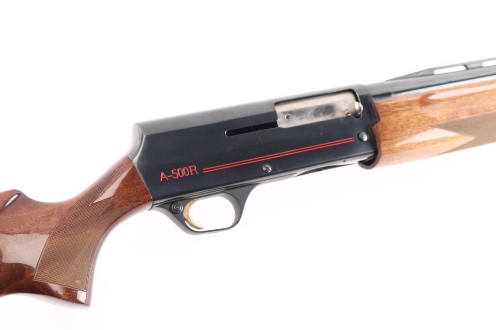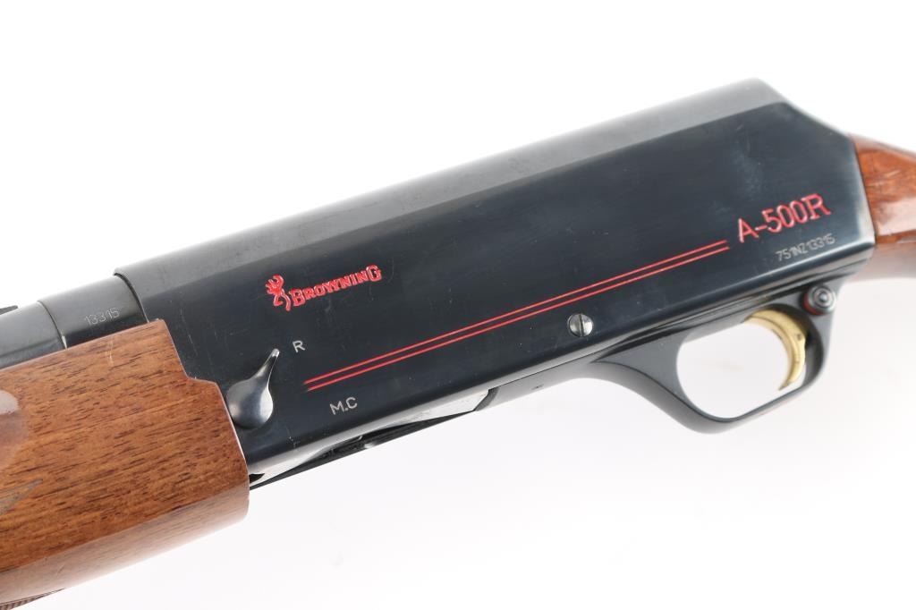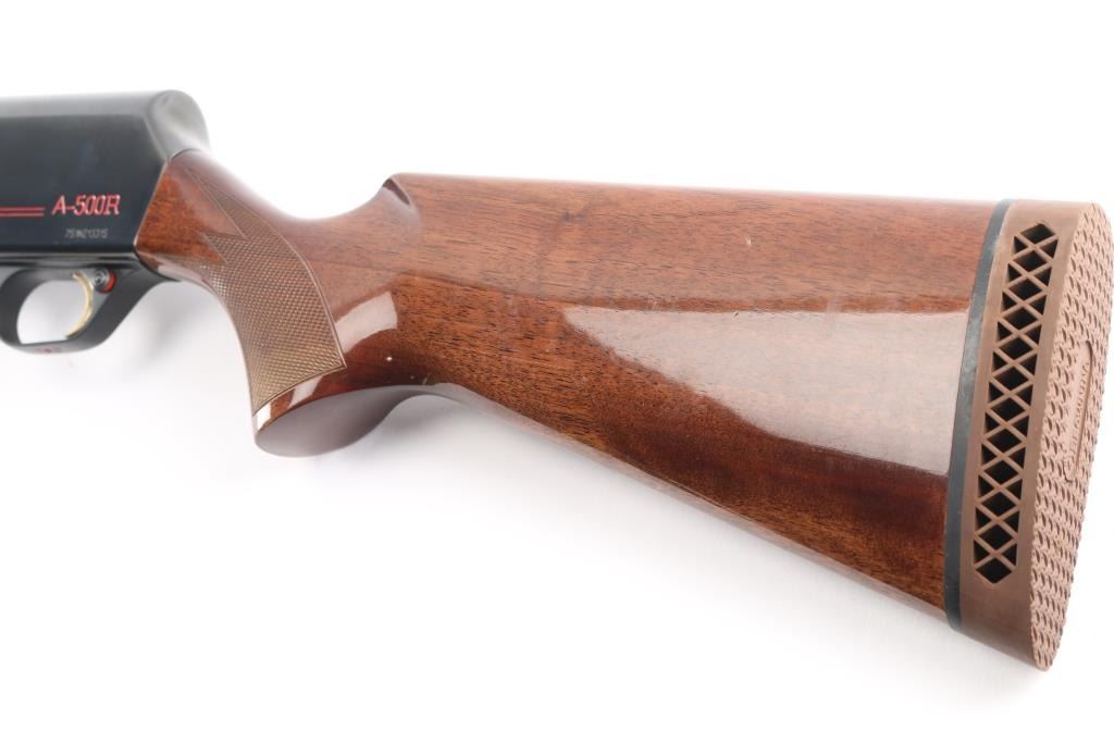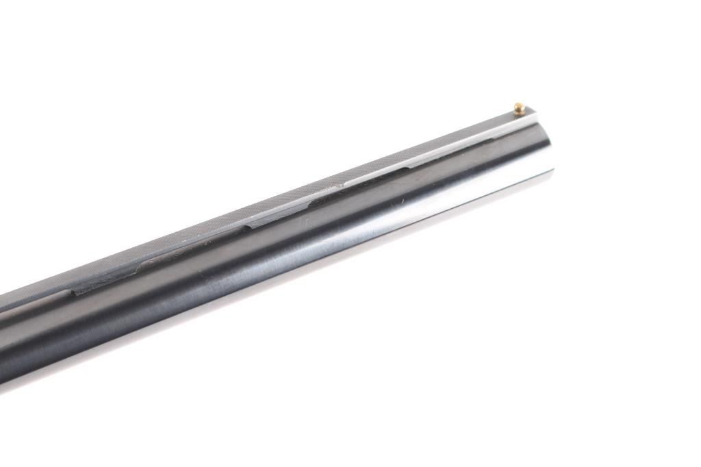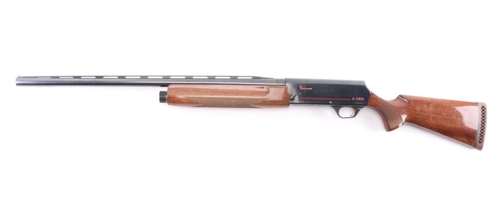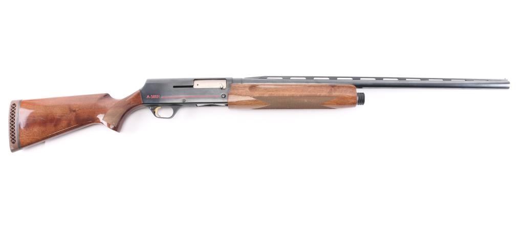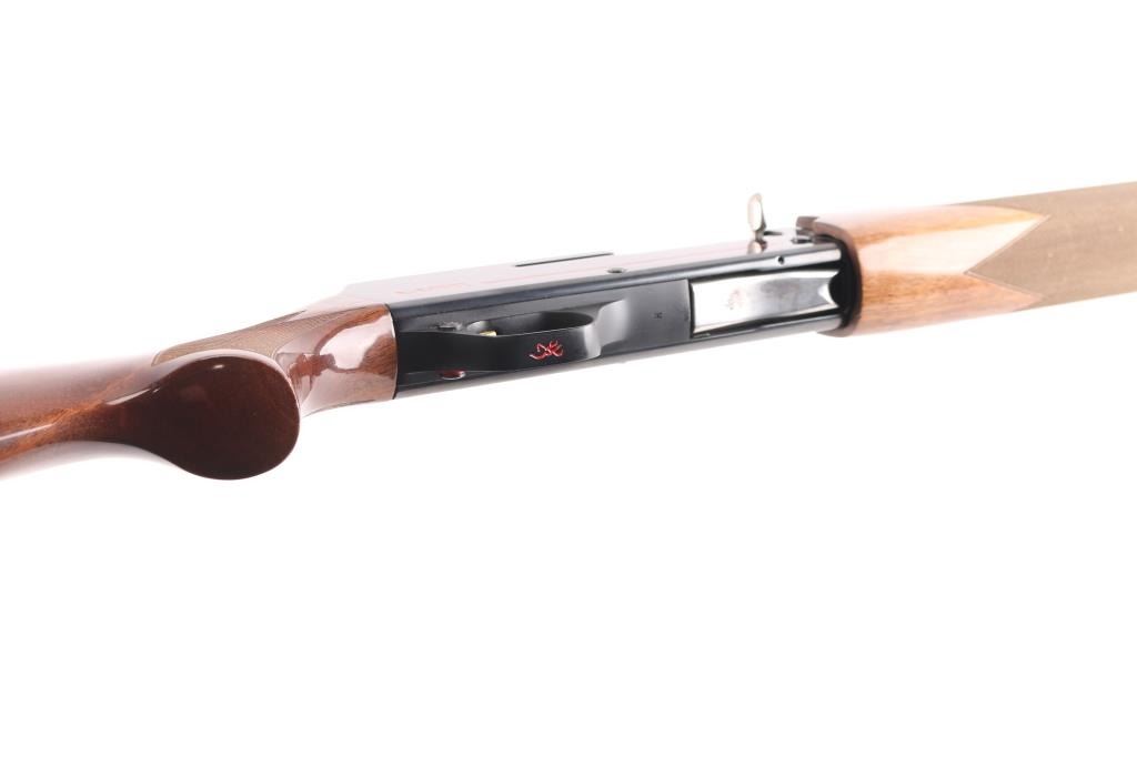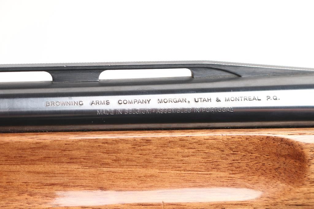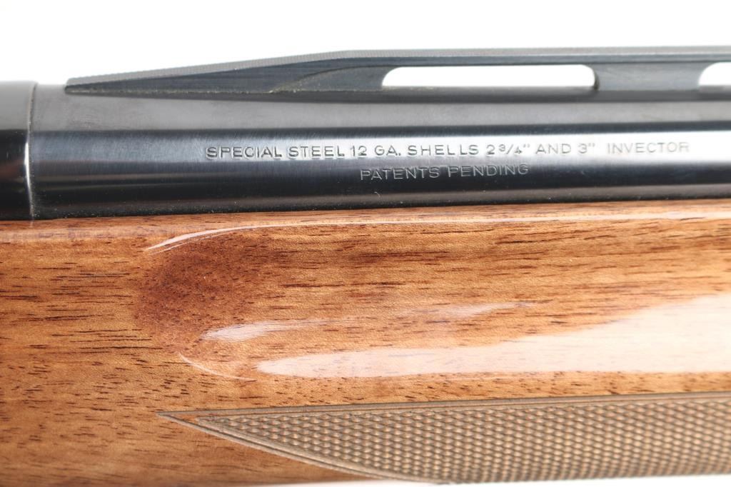 Self adjusting recoil-operated semi-automatic shotgun chambered for 2 3/4" & 3" shells, made in Belgium & assembled in Portugal circa 1991. Features a blued finish, 28" vent ribbed barrel with Invector improved cylinder choke installed, brass bead front sight, 1/2 length tube magazine, polished bolt, smooth gold trigger, push button safety, magazine cut-off lever, high gloss checkered walnut forend and pistol grip shoulder stock with aftermarket recoil pad. Shotgun exhibits approximately 96% of it's blued finish showing a few superficial scratches/handling marks on the receiver. Action is smooth, bore is excellent and wood stocks are very good with moderate small blemishes. LOP is 14 1/4".
