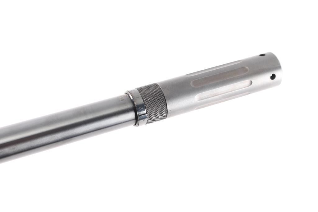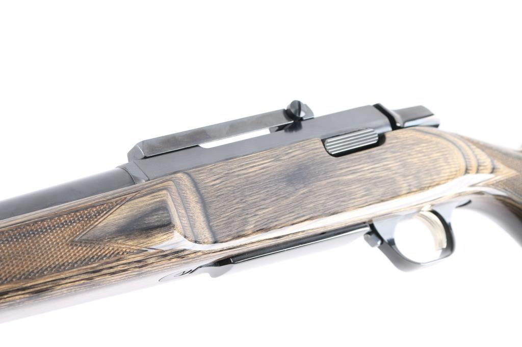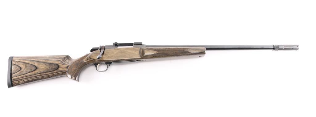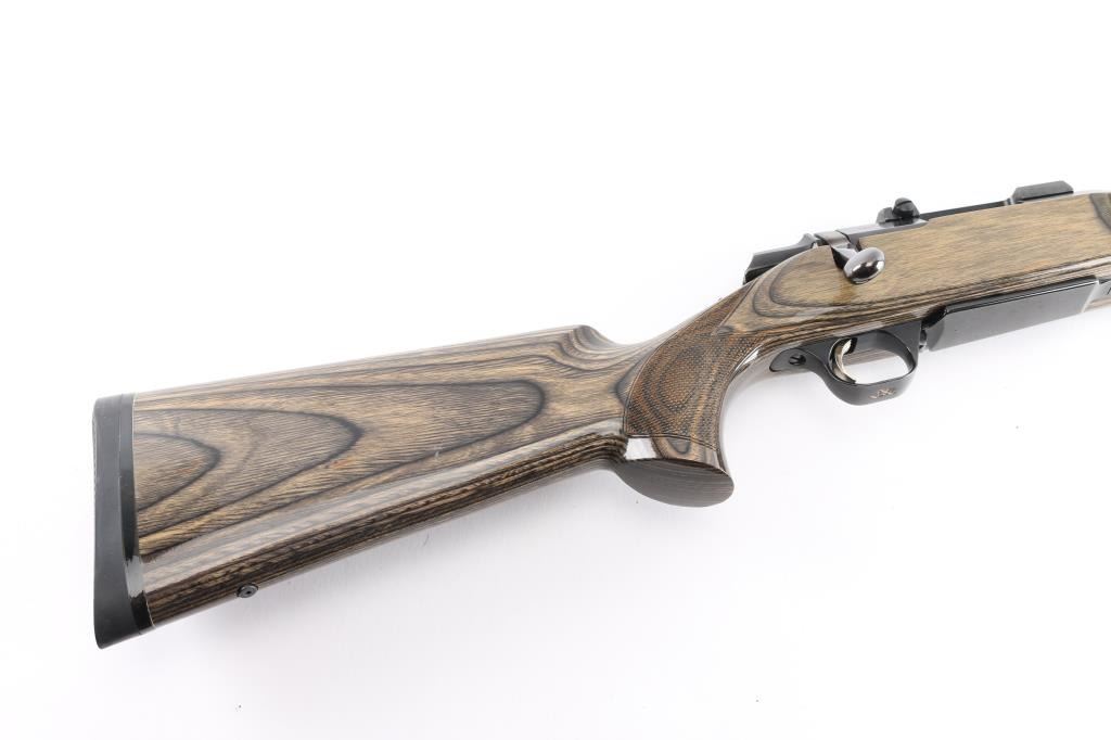 'Hunter' Bolt action rifle manufactured in Japan circa 1995. Features 24" barrel with BOSS adjustable stabilizing weight, blued finish, urethane finished pepper laminate wood stock (curved wrist, checkering at wrist & sides of semi beaver tail forend, solid rubber factory butt pad, plug screws at sling stud locations), hinged floorplate (holds a magazine that can be detached from the open floorplate), manual safety, no sights, Leupold one piece base (no rings, no optic). Engraved Buckmark logo on trigger guard is filled with gold paint. Bore is very good condition. Retains 95% finish with handling marks and edge losses. Stock is very good with minor creases and dents.