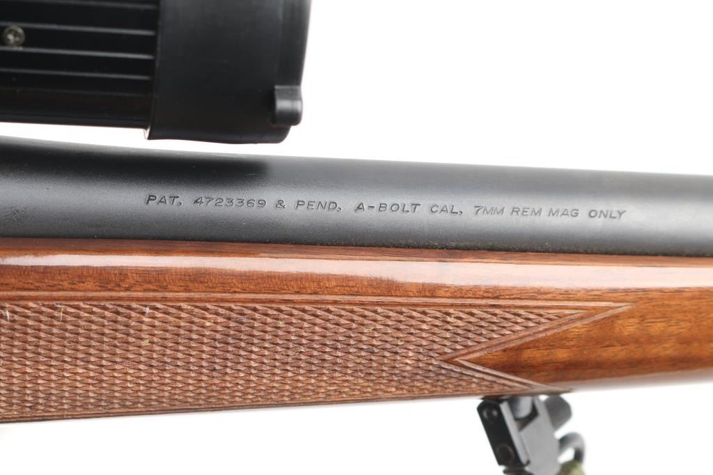 Hunter bolt action center fire rifle manufactured in Japan by Miroku for Browning circa 1994. Features a matte blue finish, urethane finished walnut stock , curved wrist, gold toned serrated trigger, checkering at wrist & forend, black rubber recoil pad, 60° throw bolt, detachable double-stack magazine and strong bolt round out, 26" barrel including BOSS (Ballistic Optimizing Shooting System) muzzle brake system, no provisions for sights, tilted bolt handle with flattened knob, stainless bolt, hinged floorplate, sliding tang safety, grooved dovetail along receiver top, bolt release on left receiver, cocking indicator. Mounted with a Nikon4-12X40 scope with fine crosshair reticle, clear optics. Bore is excellent/bright. Wood is very good with minor scratches and some dings on the left wrist, action is smooth, finish is about 98% with a couple of minor scratches on the receiver. Camo nylon sling attached.NRA condition-Excellent. Modern Firearm.