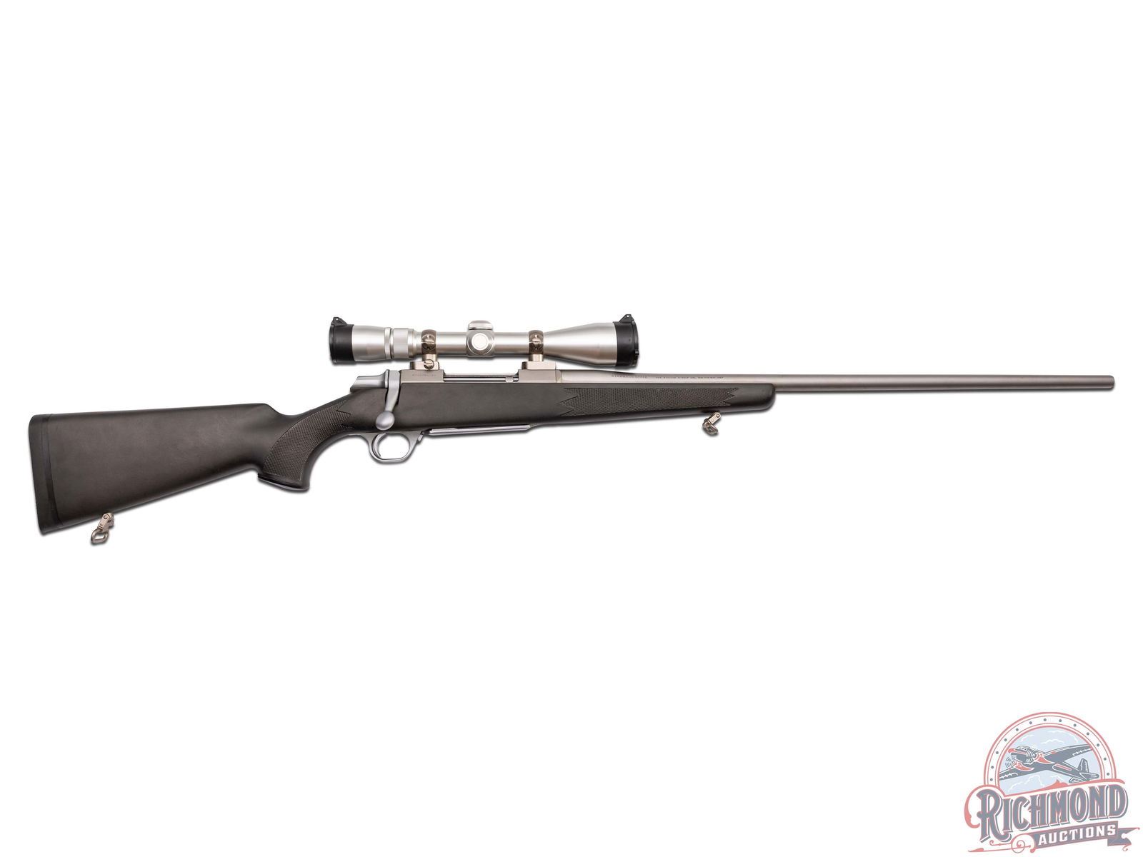 Made in Japan by Browning in 1993. 26" stainless round tapered sightless barrel in 7M/M Rem Mag caliber with Browning address and caliber marking. Stainless A-Bolt action with stream-lined bolt and standard trigger. Action fitted with stainless finish Nikon 3-9x-40mm scope with Duplex reticle and Butler Creek caps. Stainless trigger guard and detachable floorplate with gold washed Browning Deer Head Logo. Synthetic black checkered stock with stainless detachable swivels and Browning hard rubber recoil pad. LOP: 13-3/4". DAC: 1-1/4". DAH: 2". CALIBER: 7M/M Rem Mag. S/N: 97499NX757. FFL STATUS: Modern.