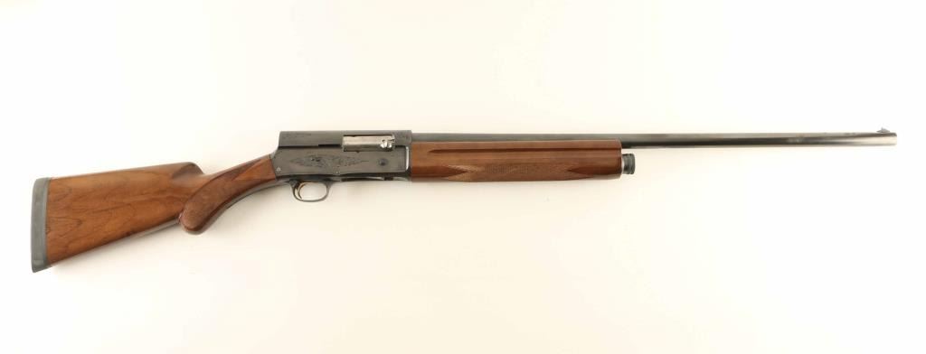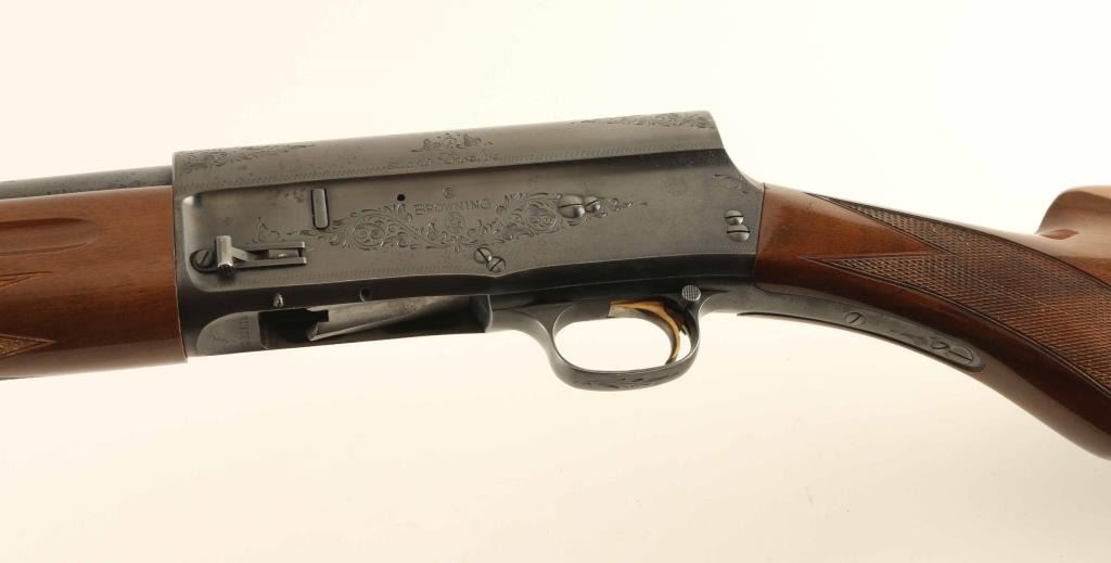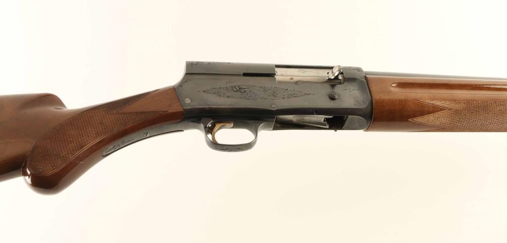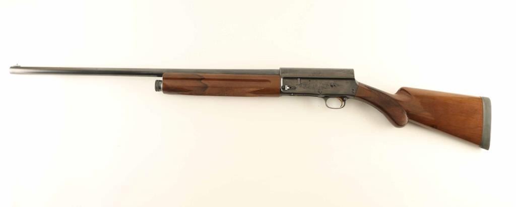 Belgian semiautomatic shotgun imported by Browning Arms Co, St Louis MO. Takes 2-3/4" shells. Features approx 28" plain barrel, choke measures FULL, steel front bead, blued finish, gold accent trigger, limited engraving on receiver, checkered wood, Prince of Wales shaped pistol grip, solid rubber recoil pad, manual safety. Bore is excellent condition. Retains 90% deep blue, with scratches, patina spots on barrel, rub marks where barrel recoils. Wood is very good condition with scuffs and scratches. Condition is NRA Very Good+ *** Modern Firearm ***