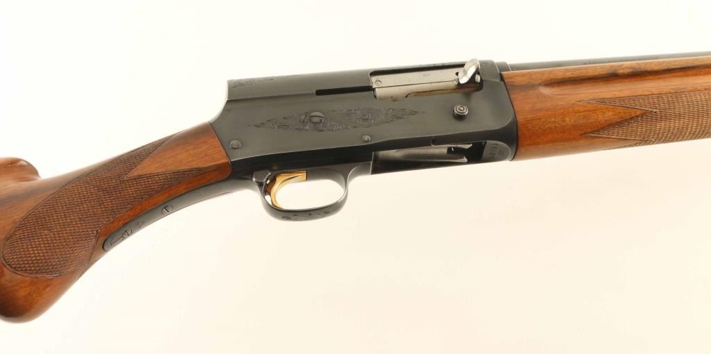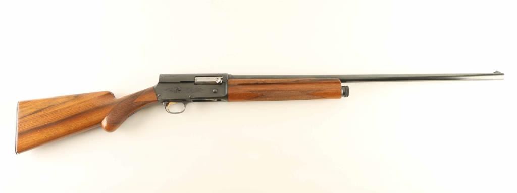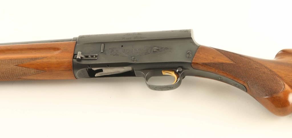 Belgian semiautomatic shotgun imported by Browning Arms Co, St Louis MO. Features blued finish, engraved receiver, checkered wood forend, wood butt with checkered Prince of Wales grip, flat plastic buttplate, 27.5" plain barrel, steel front bead, fixed MOD choke, manual safety. Accepts 2-3/4" shells. Bore is very good condition. Retains 90% blue with scratches & handling marks. Stock is near excellent with some shallow small dents. Condition is near NRA Excellent *** Modern Firearm ***
