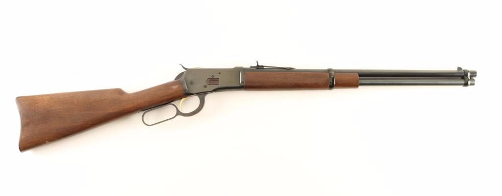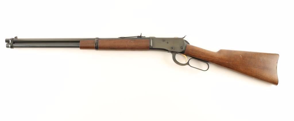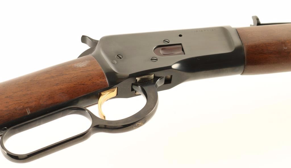'Grade I' Japanese made lever action repeating rifle chambered in .44 Magnum. circa 1983. Features a blued finish, 20" barrel, full-length tube magazine, raised patridge front sight, adjustable semi-buckhorn rear sight, smooth gold trigger, checkered hammer spur, two barrel bands, smooth walnut forend and straight grip shoulder stock with metal carbine buttplate. Includes the original factory box with manual. Rifle exhibits approximately 98% of it's original blued finish showing little wear with the loading gate turned plum. Action is smooth, bore is pristine and wood stocks are very good with some blemishes. Condition is near excellent in box. ***Modern Firearm***