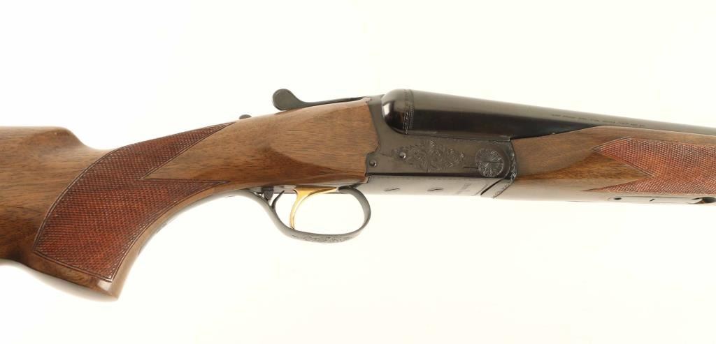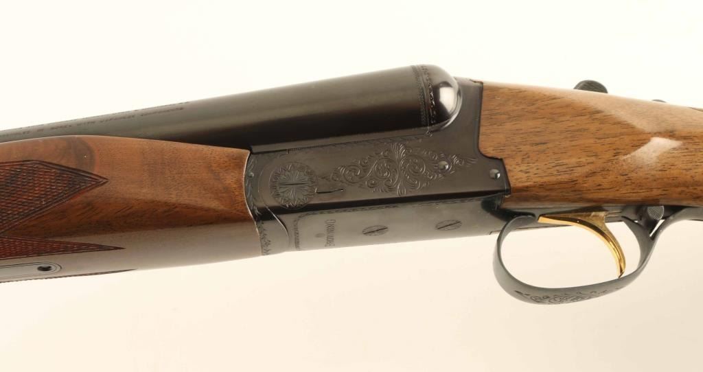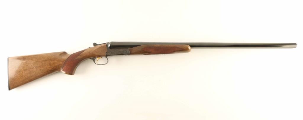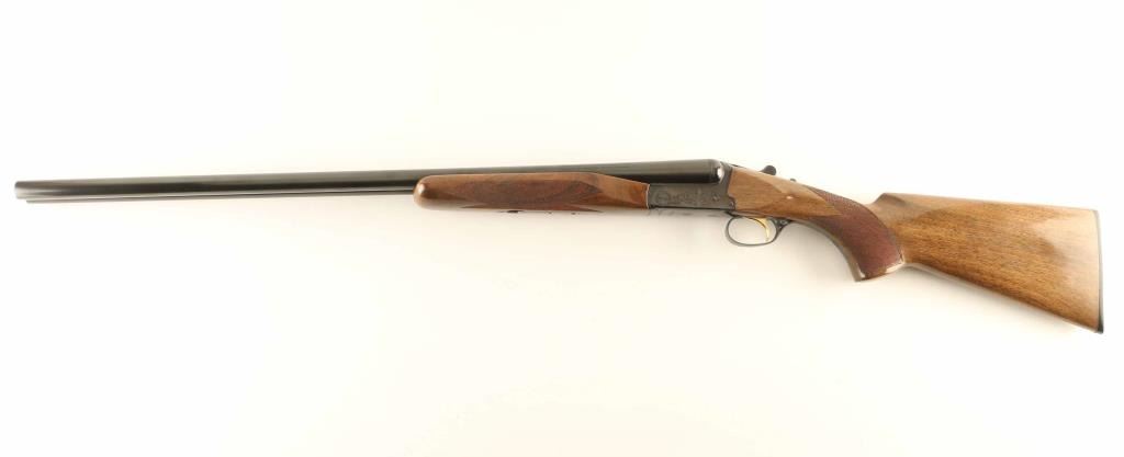 Assembled in Korea with Japanese parts, imported by Browning Arms Co, Morgan UT. Double barrel side-by-side shotgun takes up to 3" shells. Features blued finish, engraved receiver, urethane finished wood, checkered wide beavertail forend, checkered pistol grip stock with plastic buttplate, single trigger with gold color accent, barrel selector at rear of trigger, tang safety, selective ejection, steel bead front sight. Engraving consists of border pattern on forward edges of receiver, floral scroll pattern on receiver sides, top of lever and on triggerguard bottom. Bores are excellent, fixed chokes measure FULL left, MOD right. Overall appearance is excellent, with 95% or better blue, few signs of handling and use. Approx stock measurements: 14" Length of Pull, 1-1/2" Drop at Comb, 2-1/2" Drop at Heel. Condition is NRA Excellent *** Modern Firearm ***