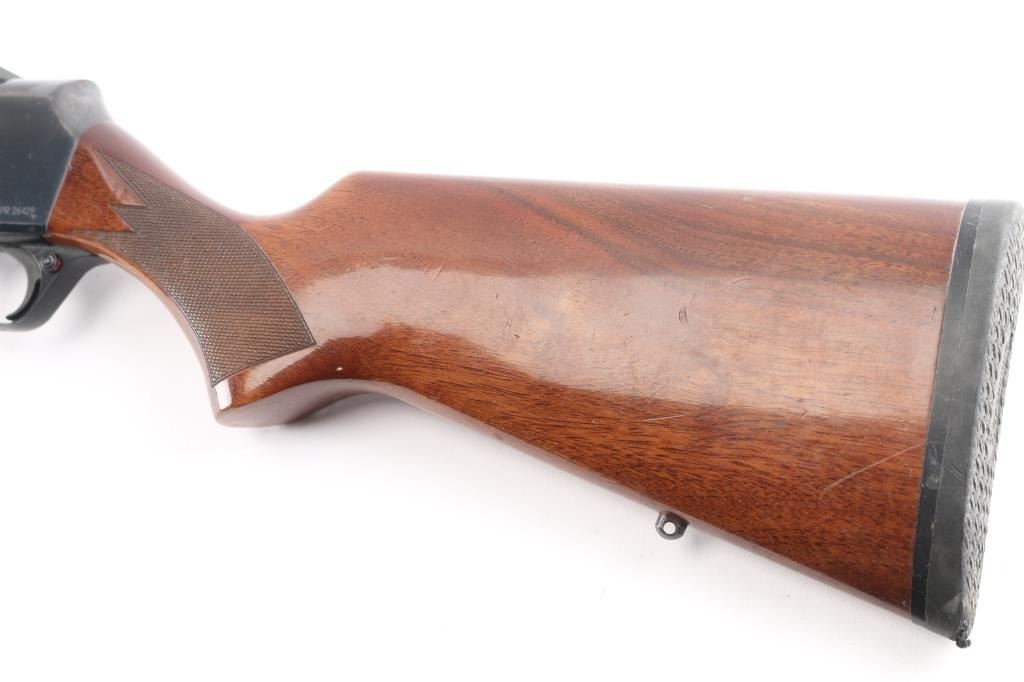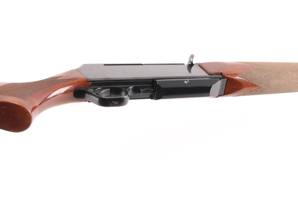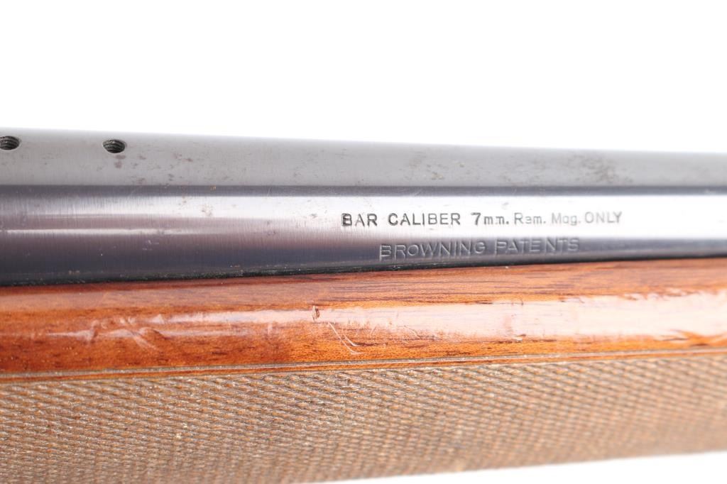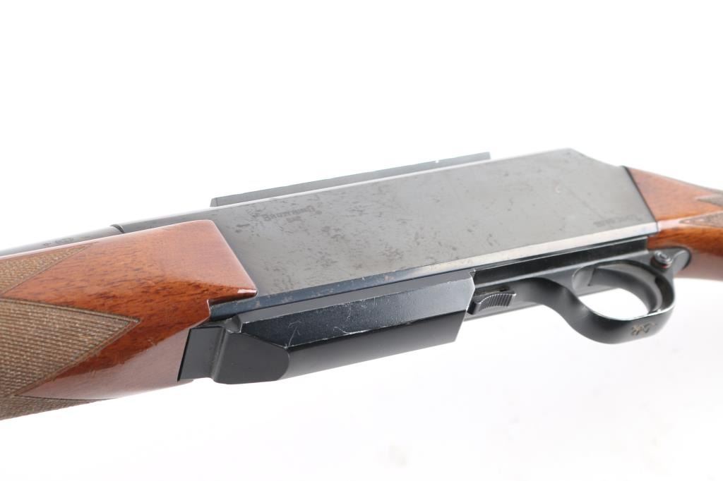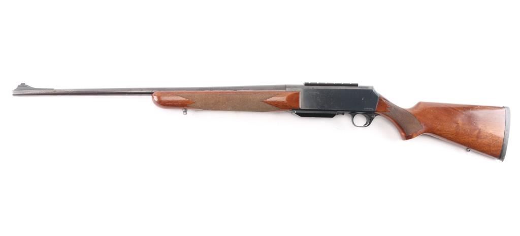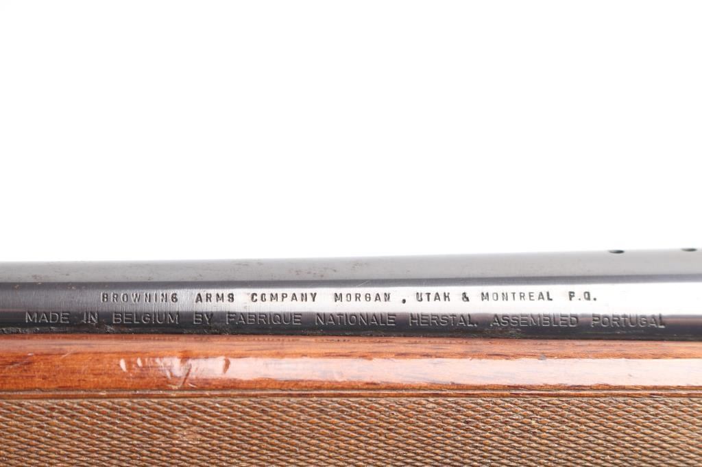 Grade I. Gas operated semi-automatic sporting rifle chambered in 7mm Magnum, manufactured in Belgium by Fabrique Nationale circa 1987, assembled in Portugal. Features a lustrous blued finish, 24" tapered round barrel, ramped blade front sight with brass bead, rear sight removed (no filler screws in holes) & scope base installed on receiver, smooth trigger, alloy trigger guard with cross-bolt safety, hinged floorplate with detachable 3 round magazine, installed swivel studs, point checkered walnut forend with high gloss finish and semi-pistol grip shoulder stock with factory recoil pad 14” LOP. Rifle retains approximately 90% of its original blued finish showing light muzzle wear, some minor handling wear on the barrel, the receiver has many minor scratches, a couple of small areas of finish loss and scattered light pin-prick pitting. Action is smooth with a crisp trigger pull, the bore is excellent, and the wood stocks are very good with minor scratches/scuffs.