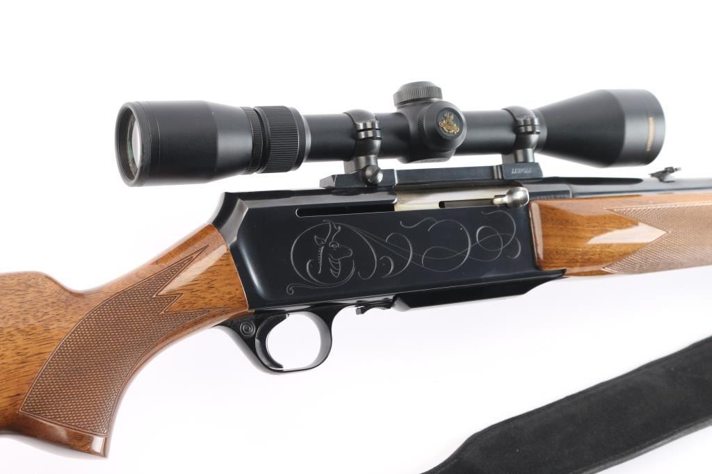 Gas operated semi-automatic sporting rifle chambered in .243 Winchester., manufactured in Belgium by Fabrique Nationale circa 1970. Features a lustrous blued finish, 22" tapered barrel, ramped, hooded blade front sight with brass bead, adjustable folding leaf rear sight, Nikon 3-9x40 scope installed on a one-piece Leupold base, duplex erticle, smooth trigger, alloy trigger guard with cross-bolt safety, hinged floorplate, steel receiver with light scroll engraving with images of Pronghorns, point checkered walnut forend, and semi-pistol grip shoulder stock with factory recoil pad. Rifle is in like new condition, ,the bore is excellent/bright, the optics are clear and the wood stocks are excellent. Nice padded brown leather sling attached. Comes in the original factory box with matching label and instructions.