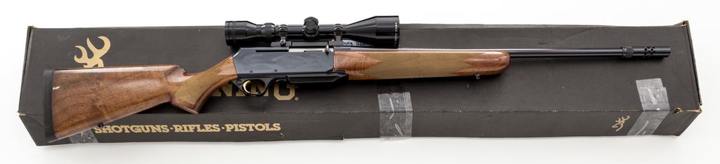 Browning BAR II Safari Semi-Automatic Rifle, #107NT06817, 7mm Rem. mag., 24'' overall barrel length which includes the BOSS muzzle brake. Metal with a blue finish; receiver with standard scroll engraving for this model. The gloss-finished pistol-grip wood stock with checkering at the wrist and forend, sling swivel studs, and factory black rubber recoil pad. Rifle also features a gold-colored trigger and hinged box magazine. Barrel came from the factory without sights and the rifle is topped with a Tasco 3.5-10x50mm scope and Leupold rings; scope with a duplex reticle. In original box with matching end label and owner's manual. Condition is excellent, appearing near new, with 99%+ original finish. Left side of receiver with one faint vertical scratch that is only visible if held at the right angle. Wood is as new with all of the gloss finish. Action is smooth and tight with a mint bore. Scope optics are bright and clear. Box shows some storage wear. Est.: $700-$1,000. (Modern)