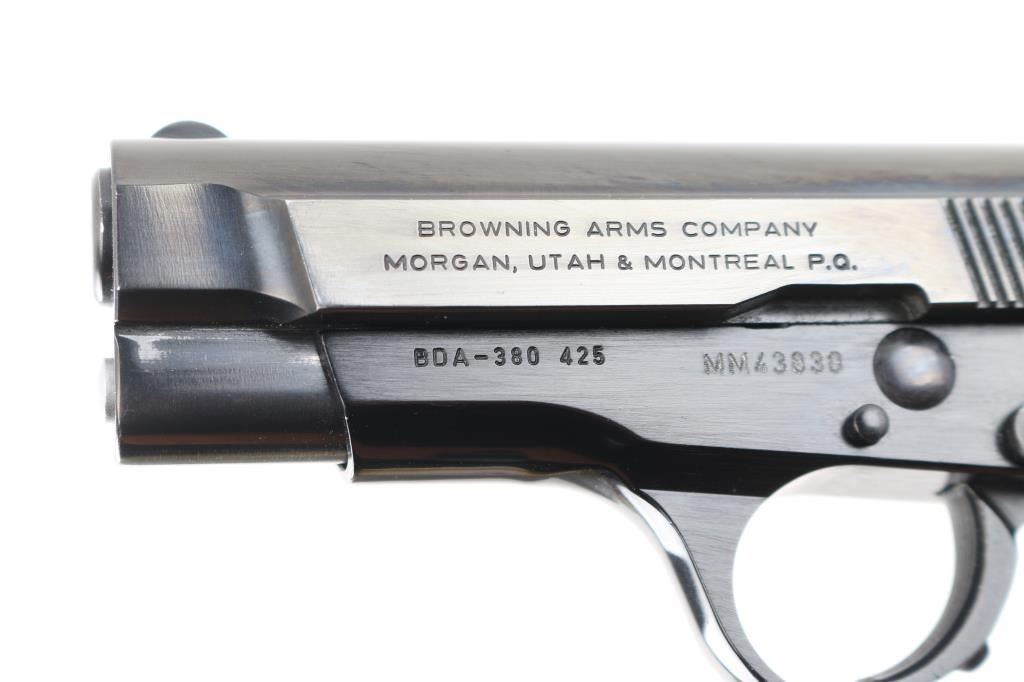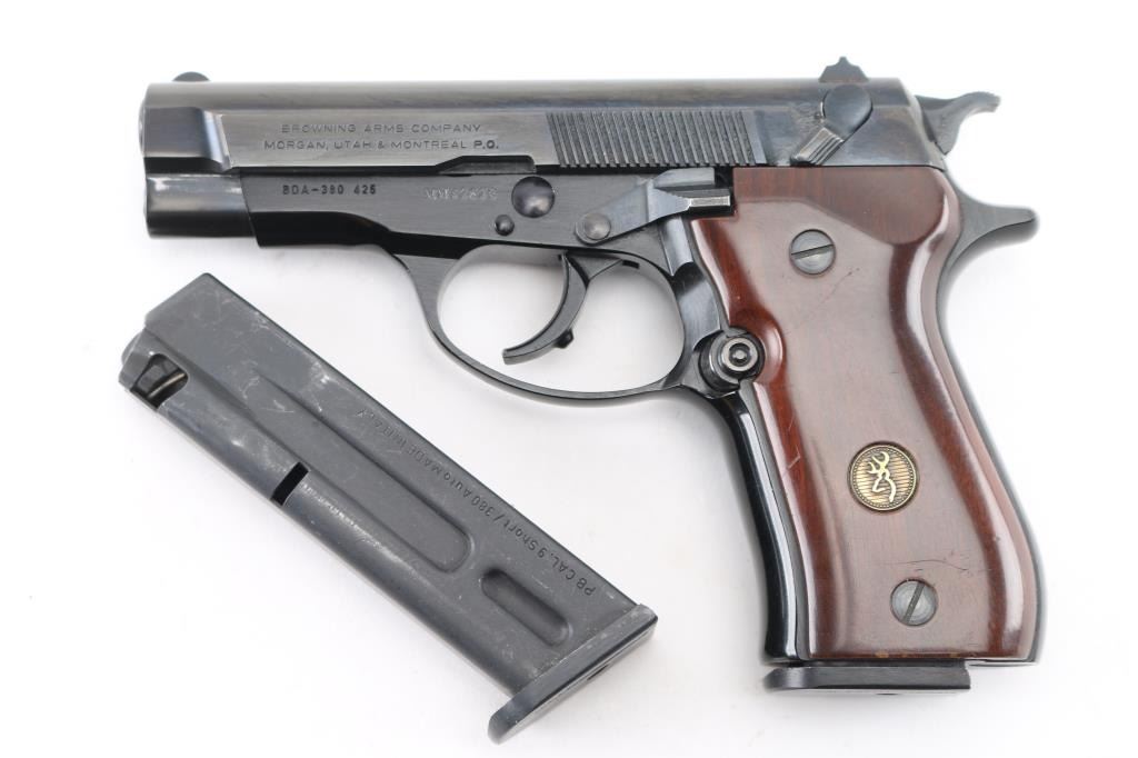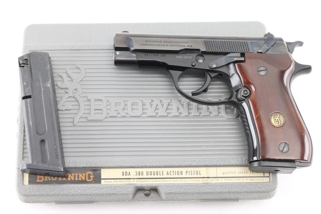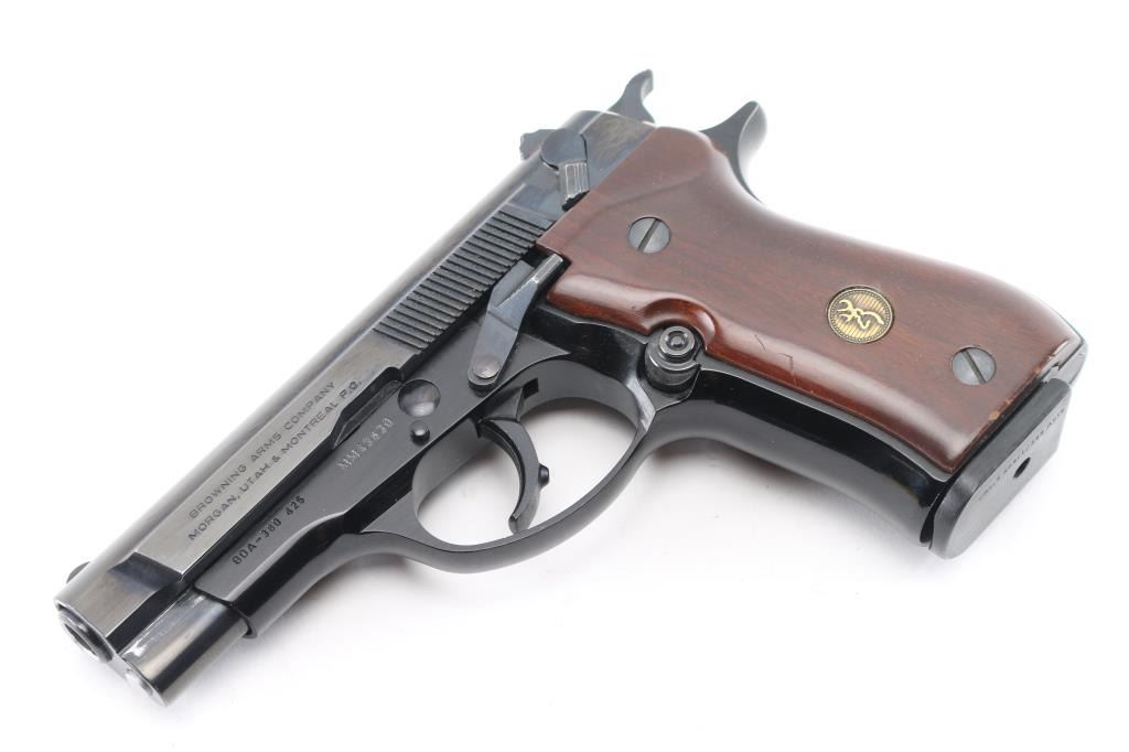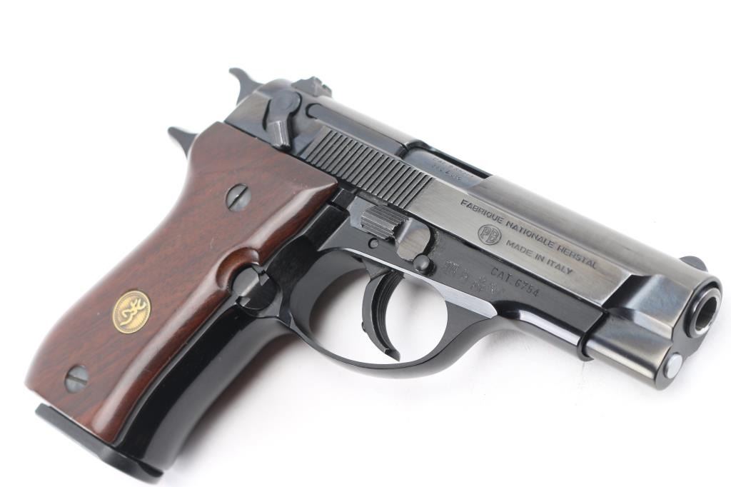 Double action semi-automatic compact pistol chambered in 9mm Short, manufactured in Italy (by Beretta, "PB" logo on slide) circa 2000, imported by Browning. Features a blued finish on steel parts, matching black color aluminum frame, 3.8" barrel, fixed round blade front sight, dovetailed rear sight with square notch, serrated trigger, serrated hammer spur, ambidextrous thumb safety/decocker on the slide, magazine disconnect safety, push button magazine release, smooth wood grips with brass Browning medallions. Bore is pristine. Retains 90% finish with rubbing wear on dust cover, handling marks. Grips are very good. Includes two magazines (with flat ribs pressed into sides, appear to hold 10 rounds), factory gray plastic box. Condition is near NRA Excellent *** Modern Firearm ***